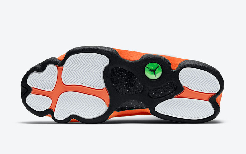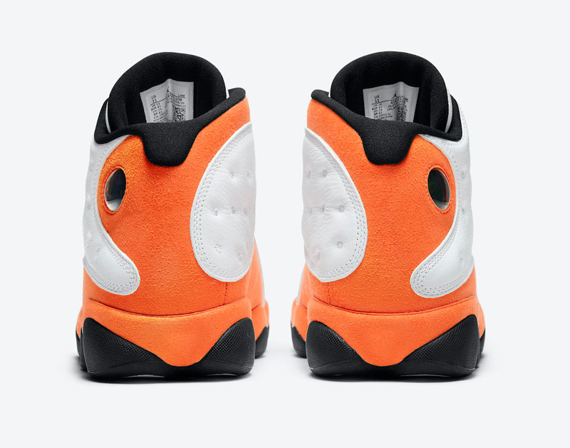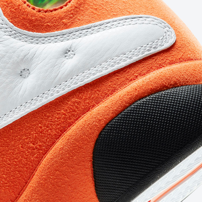 鞋身中下方以橙色麂皮材质覆盖,彰显出 Air Jordan 13 独有的规格,呈现出「扣碎」配色既视感。