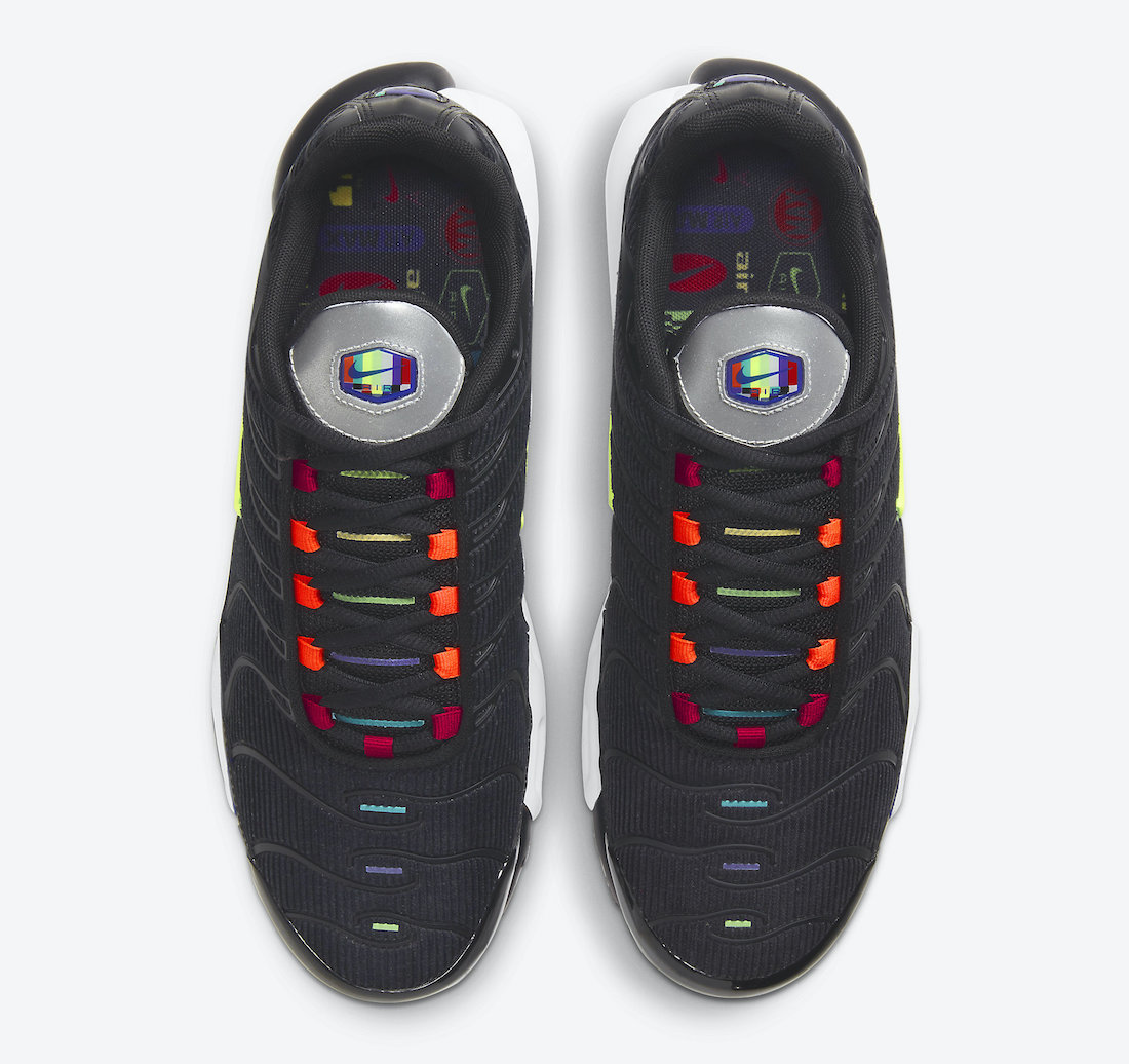 鞋身整体以黑色覆盖,搭配 Air Max Plus 经典的鞋身框架,值得注意的是这款配色的鞋身采用了灯芯绒材质,彰显高级质感。