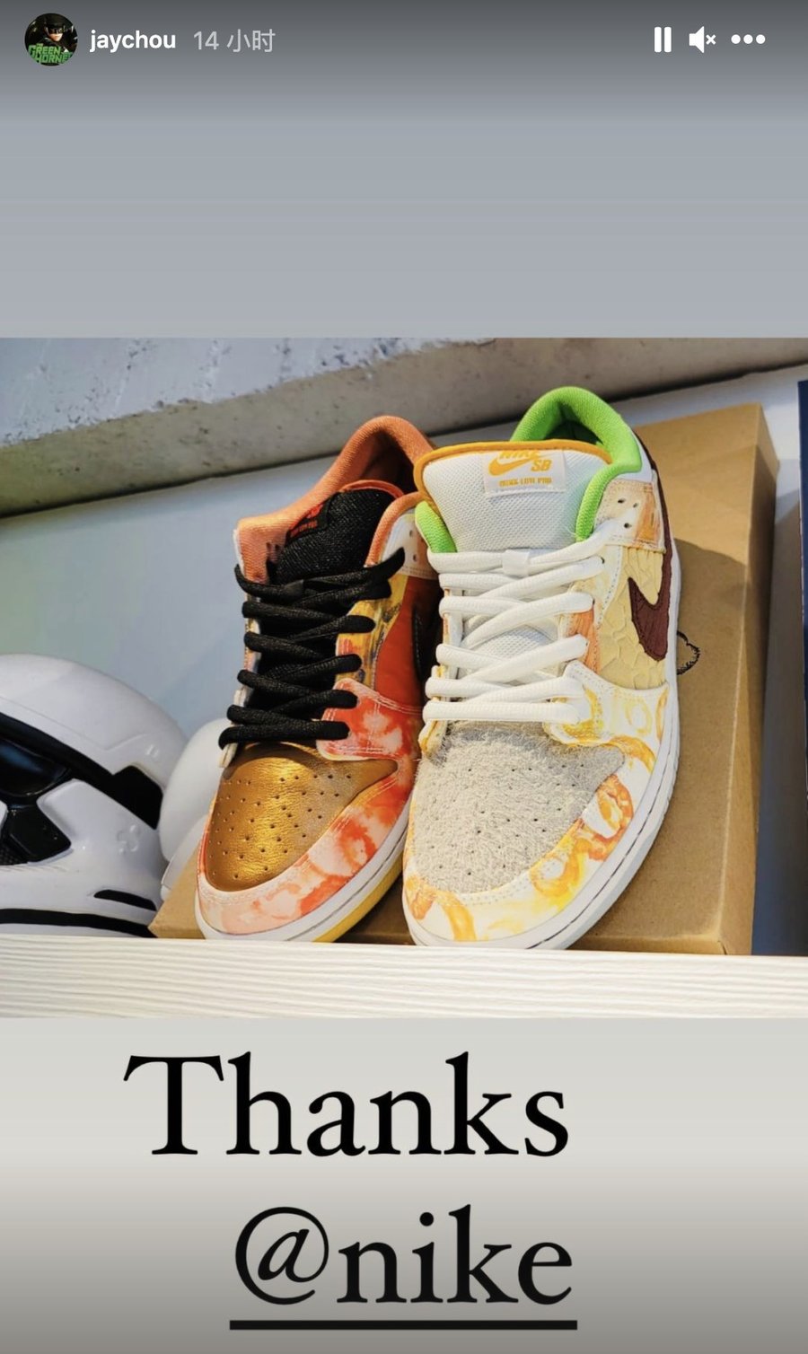 昨天又在 Instagram 快拍上晒出 Nike 送给他的 SB Dunk Low “Street Hawker”,这双鞋要在下月才会正式发售。