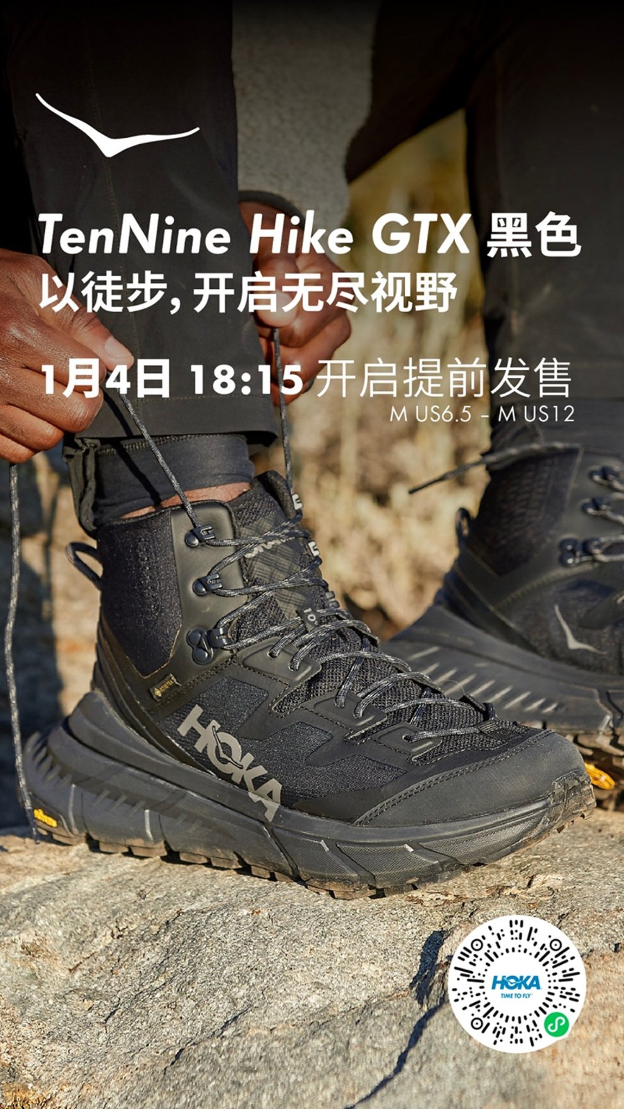 据悉,全新的 TenNine Hike GTX 黑色款将于 1 月 4 日 18:15 在 HOKA ONE ONE 官方微信小程序开启提前限量发售,发售价格为 ¥1999 元,蓝色款将随后登场,感兴趣的朋友们可以扫描下方二维码,提前准备。