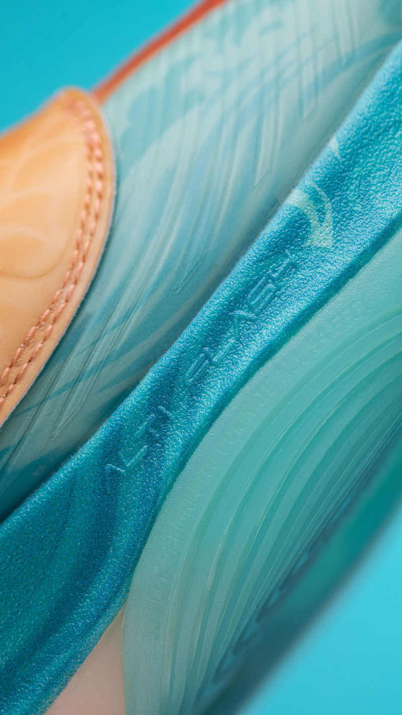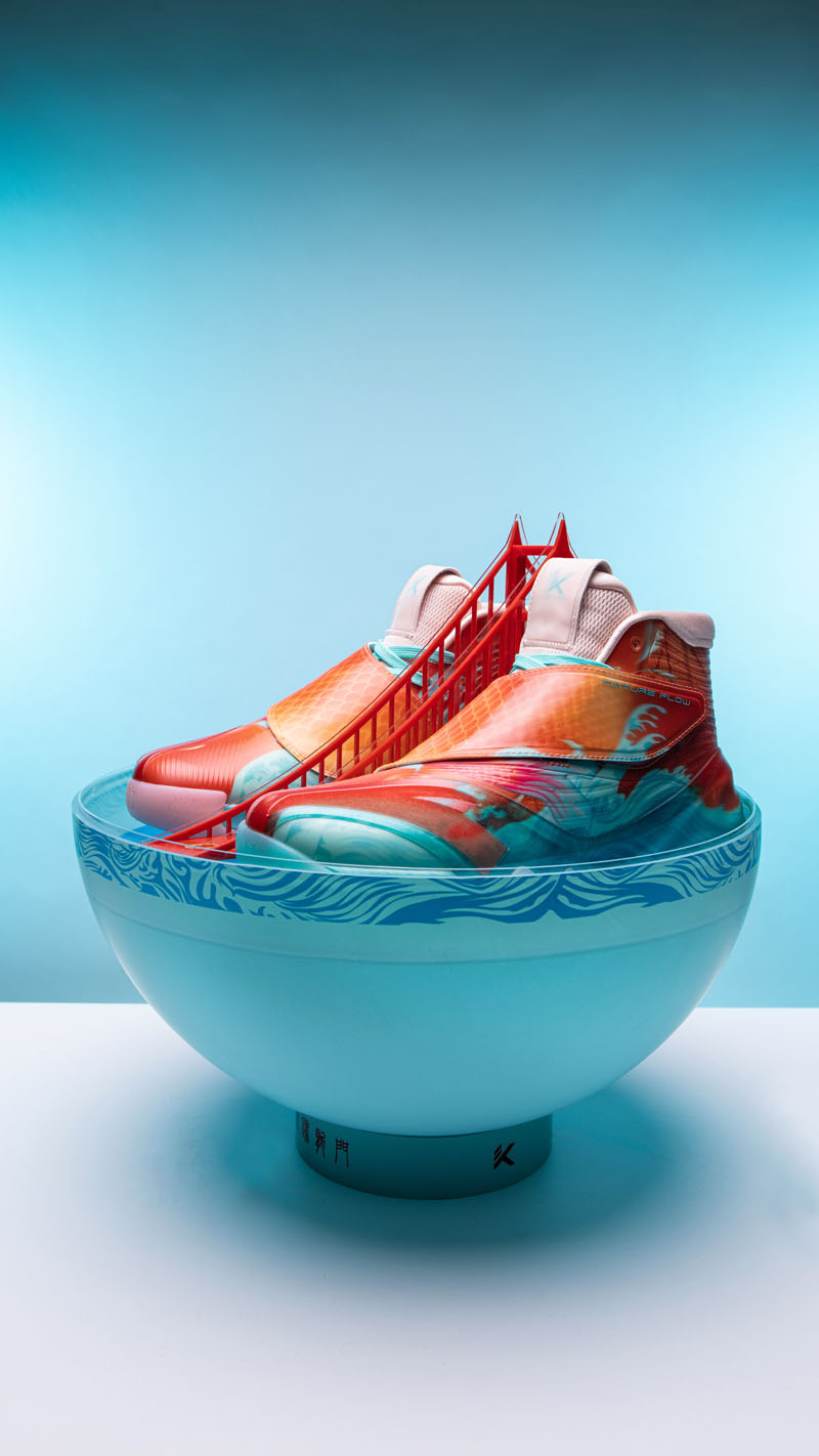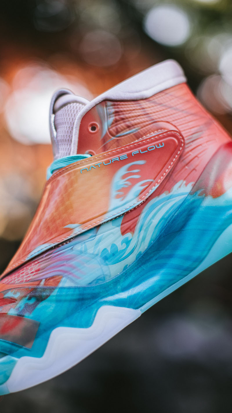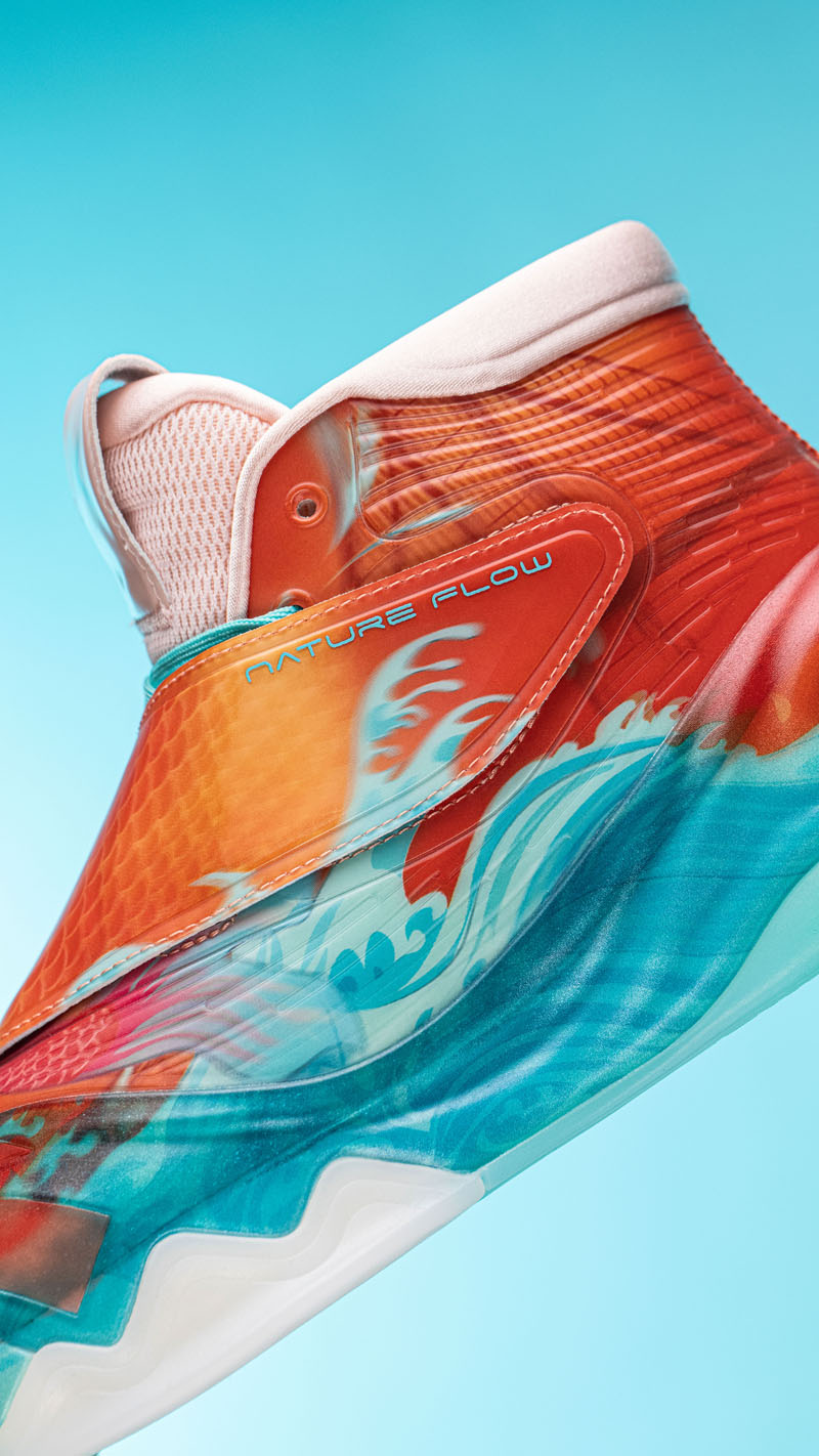 外观设计灵感来自「高山流水」,山之形、水之纹,既有球鞋的狂放张扬,又展现出中国韵味的柔美线条。