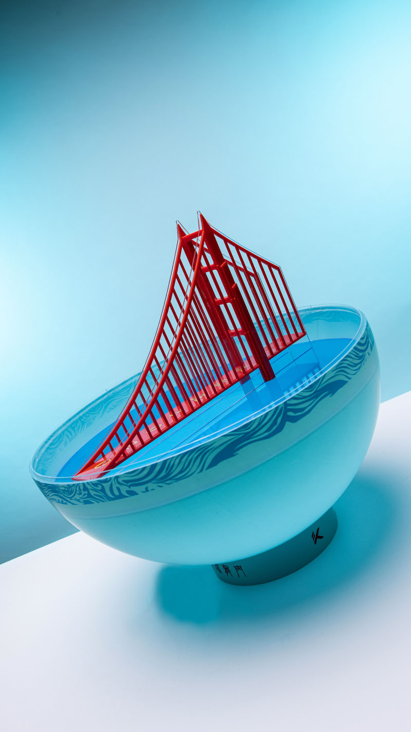后跟处浪花围绕金门大桥,锦鲤即将越过 “龙门”,将中国元素与金州的地标建筑巧妙结合。