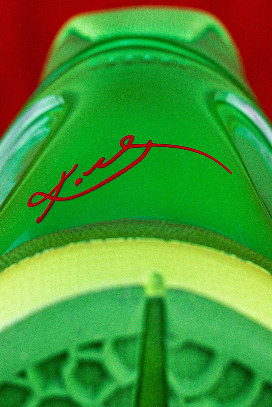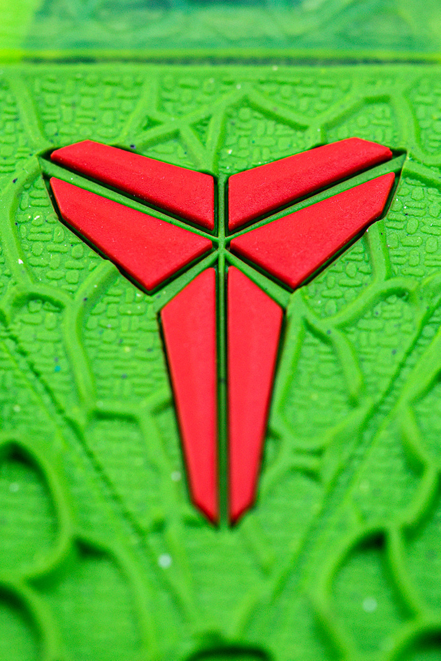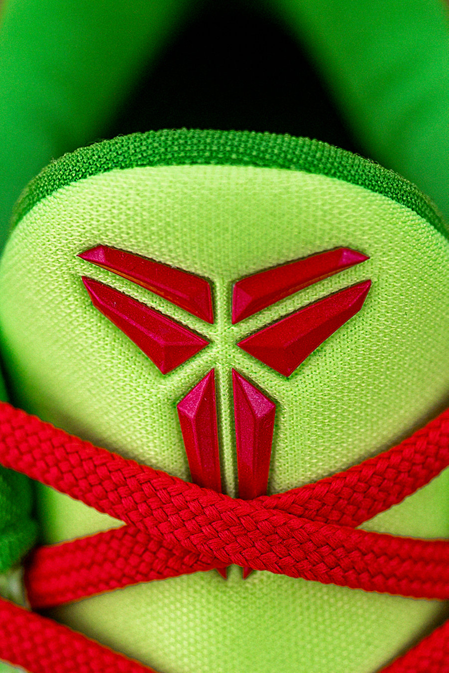 鞋舌上带有红色科比个人 Logo,在绿色底色衬托下相当亮眼,搭配红色鞋带之后两者更是融为一体。