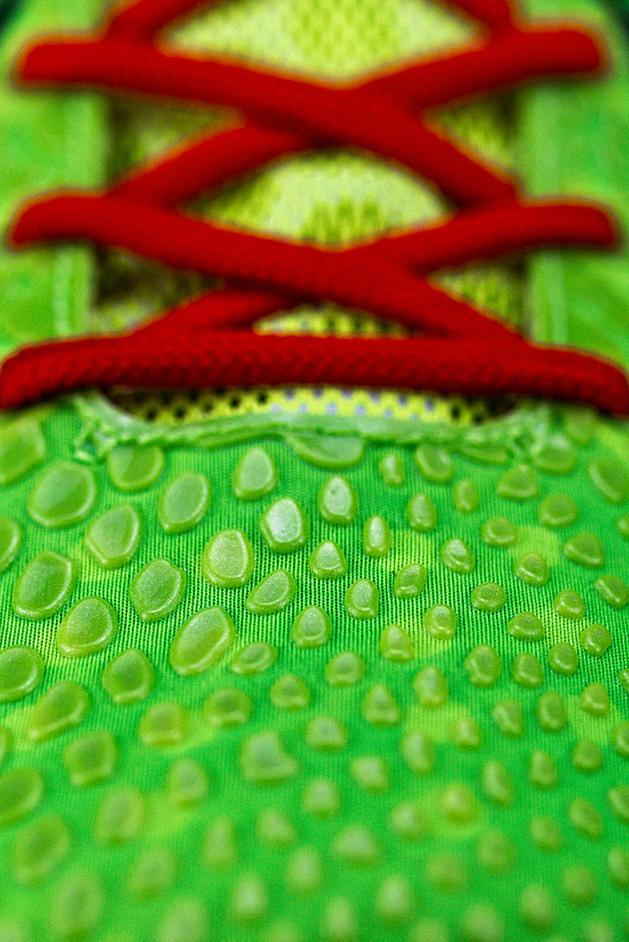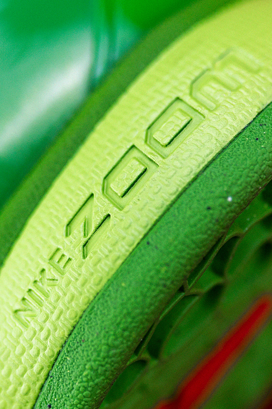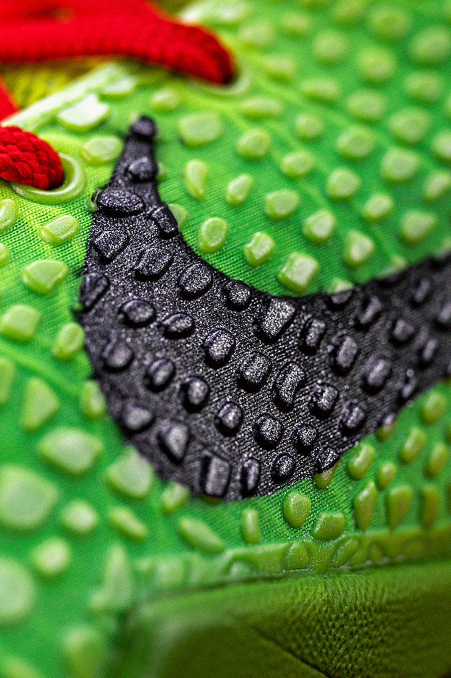 鞋舌上带有红色科比个人 Logo,在绿色底色衬托下相当亮眼,搭配红色鞋带之后两者更是融为一体。