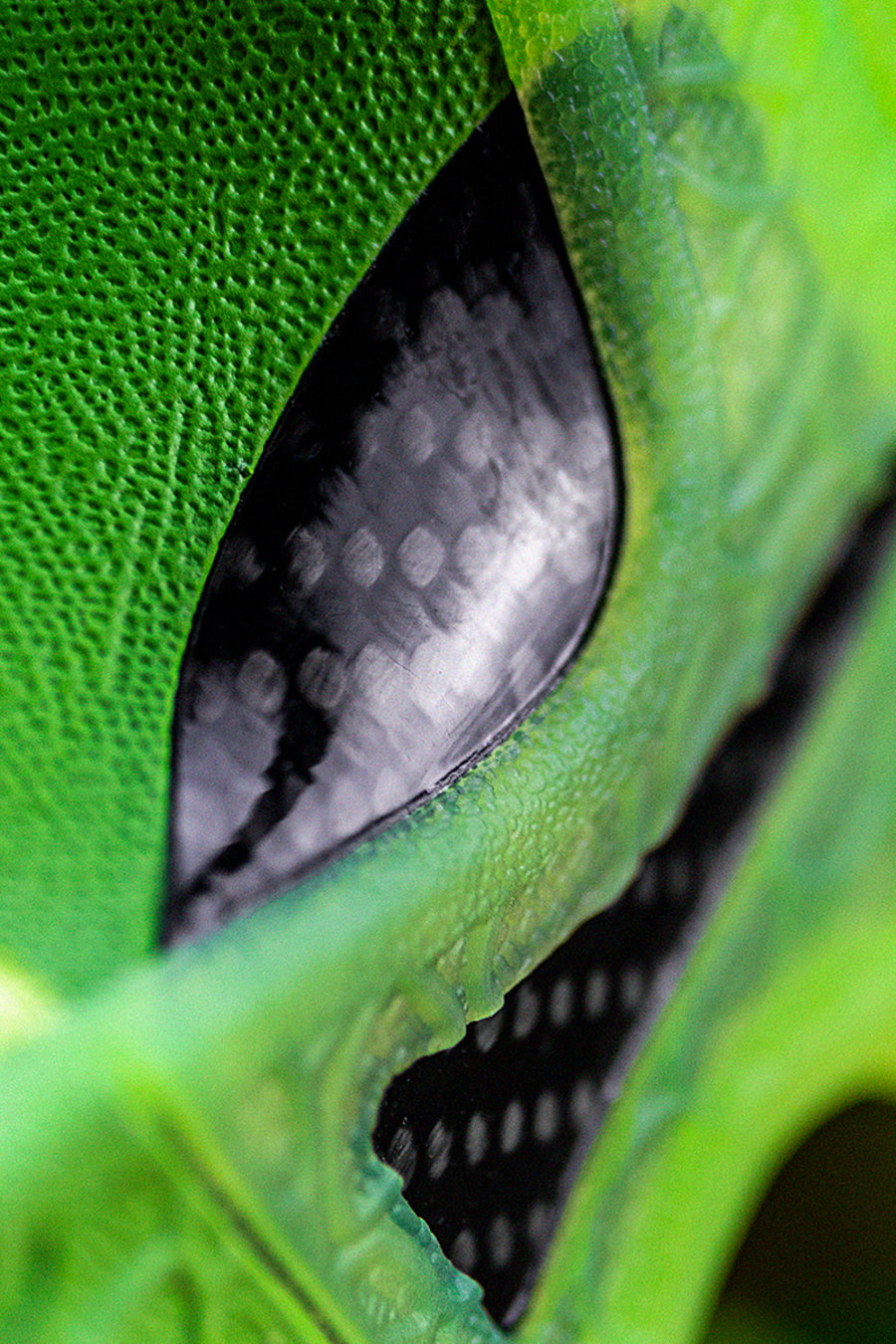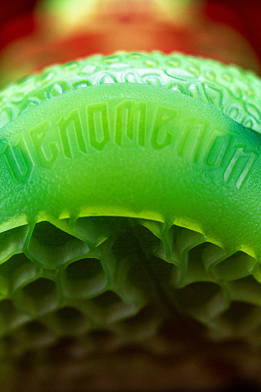 细节方面,鞋头前端以雕刻造型呈现 VENOMENON 字样,翻译为 “毒液”,尽显曼巴本色。