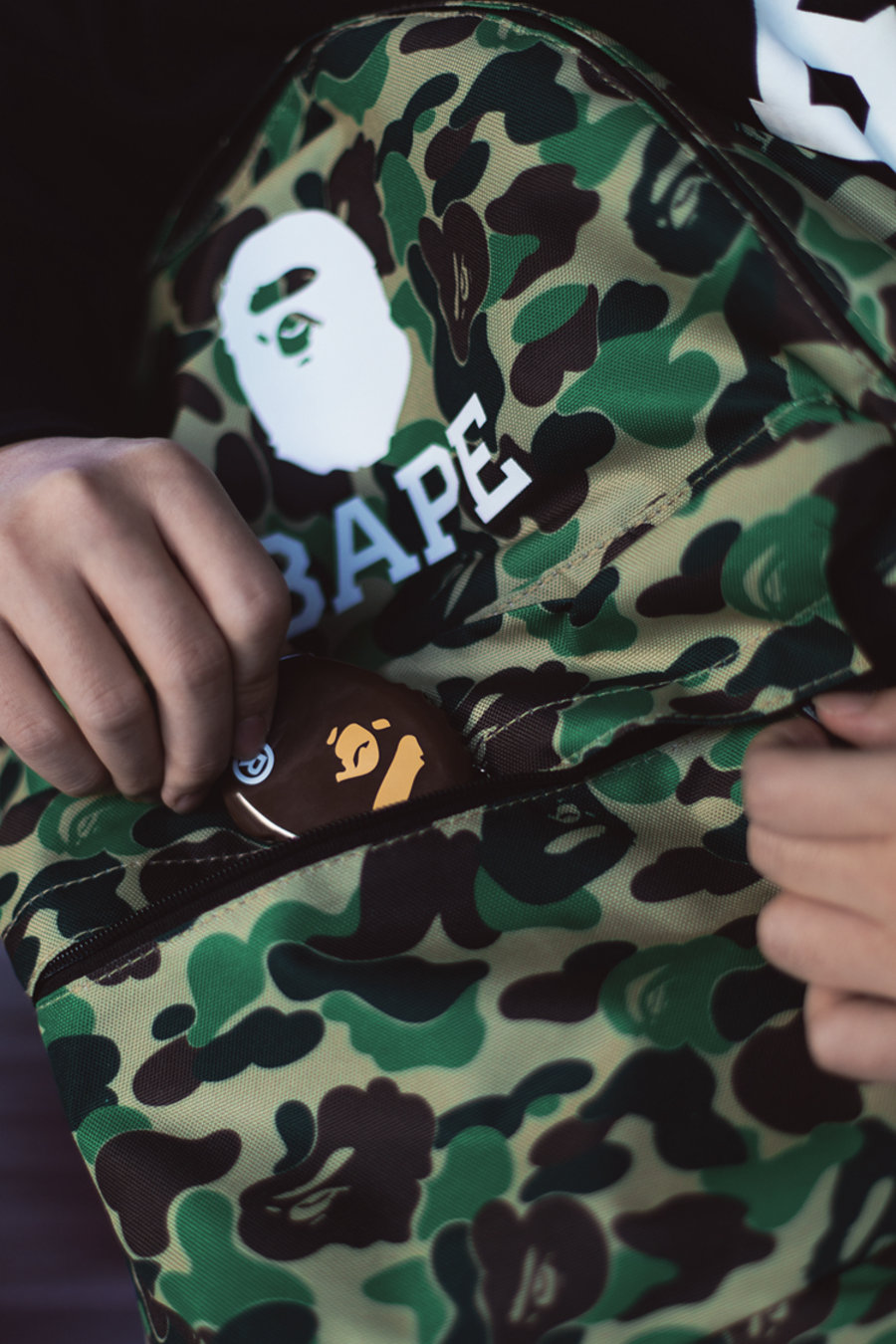 另一件黑色拉链帽衫则将 BAPE®️ 拿手的猿人 & 迷彩一并呈现。