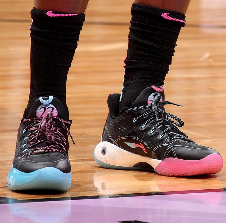 侧身李宁 Logo 以及中底均以渐变效果呈现,呼应热火队全新的城市版球衣配色。