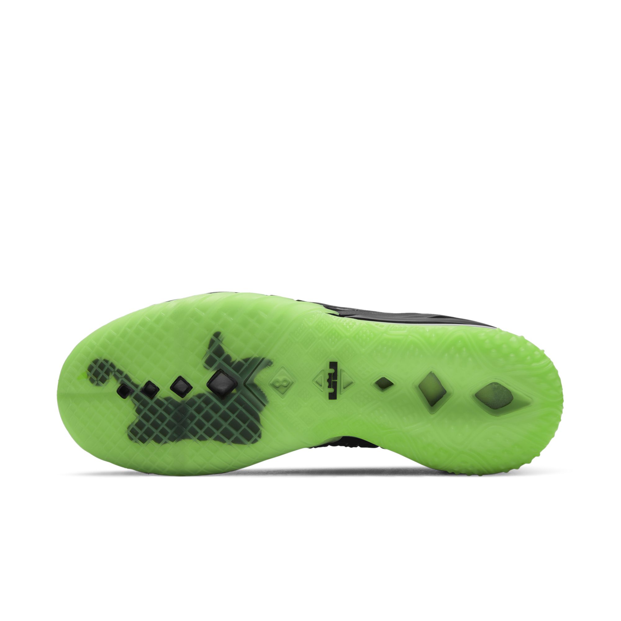 球鞋外底上有詹姆斯快攻扣篮时的剪影图案,颇为亮眼。