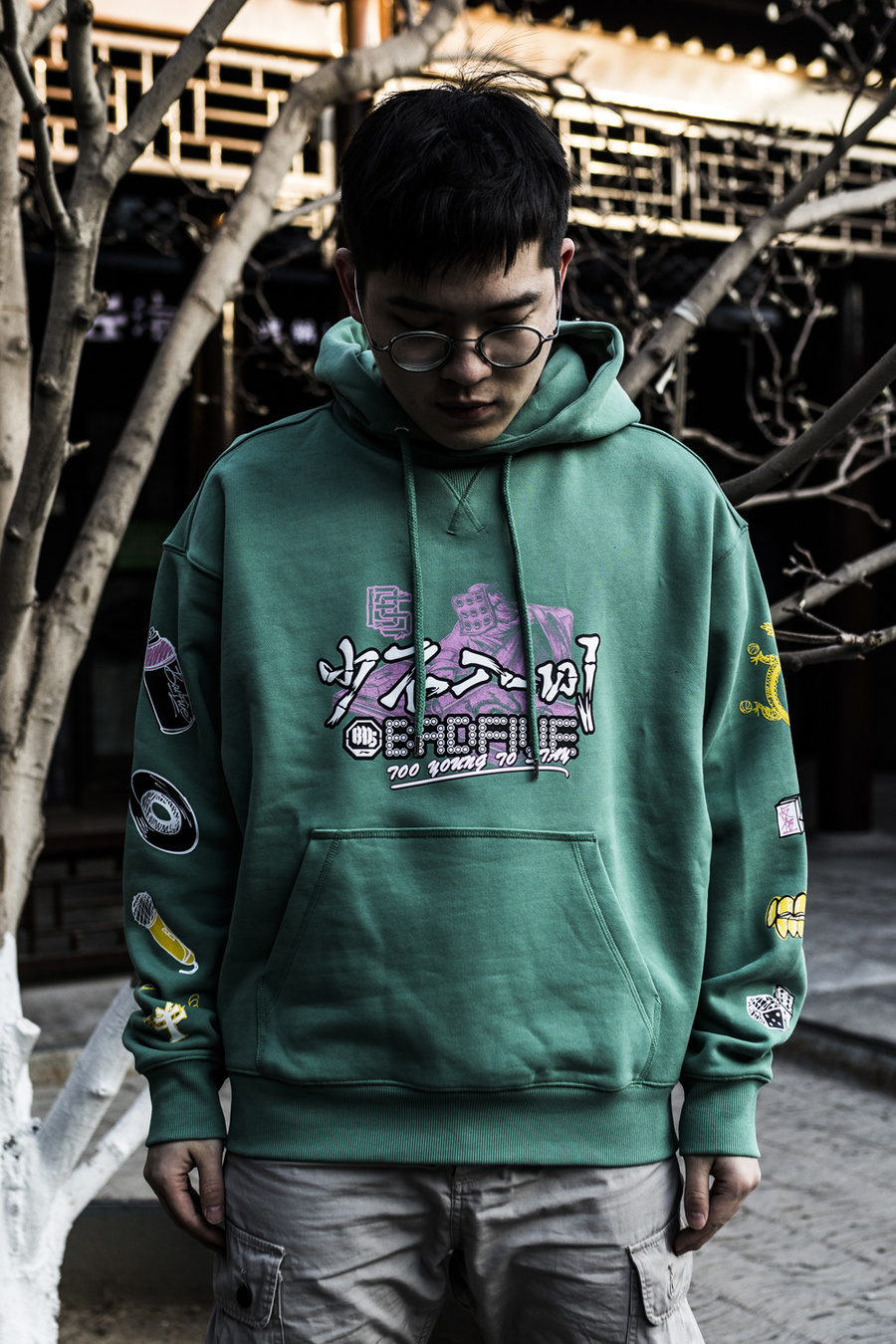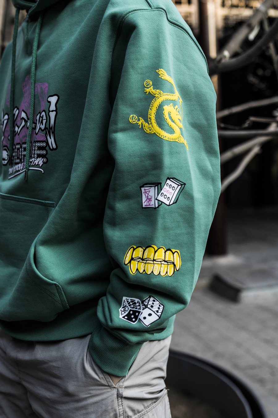 还有多款卫衣以标志性绿色为主调,覆盖丰富的印花和细节,街头潮流感十足。