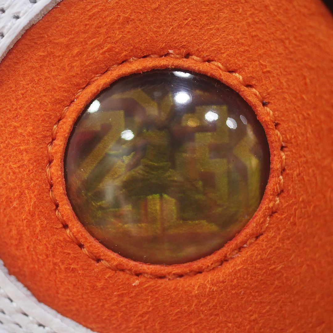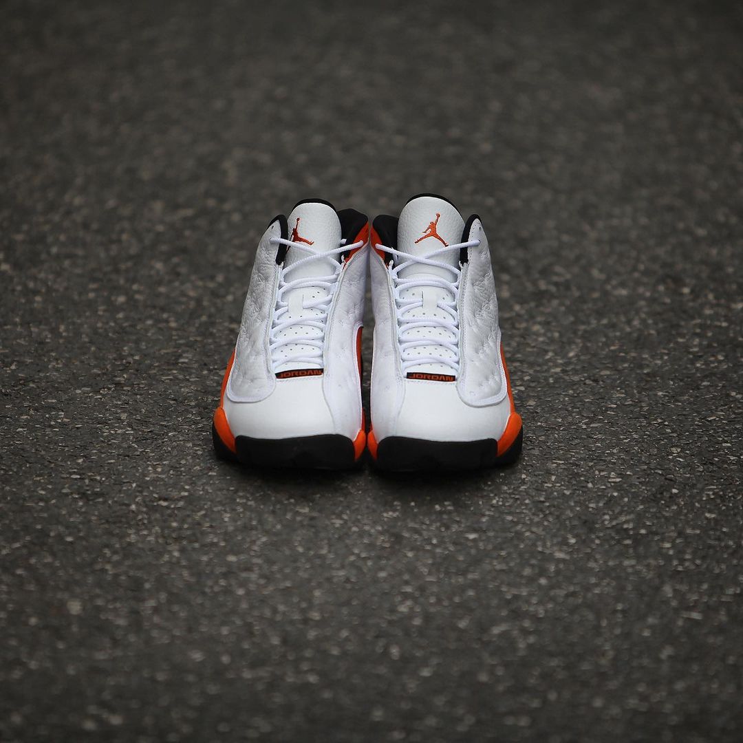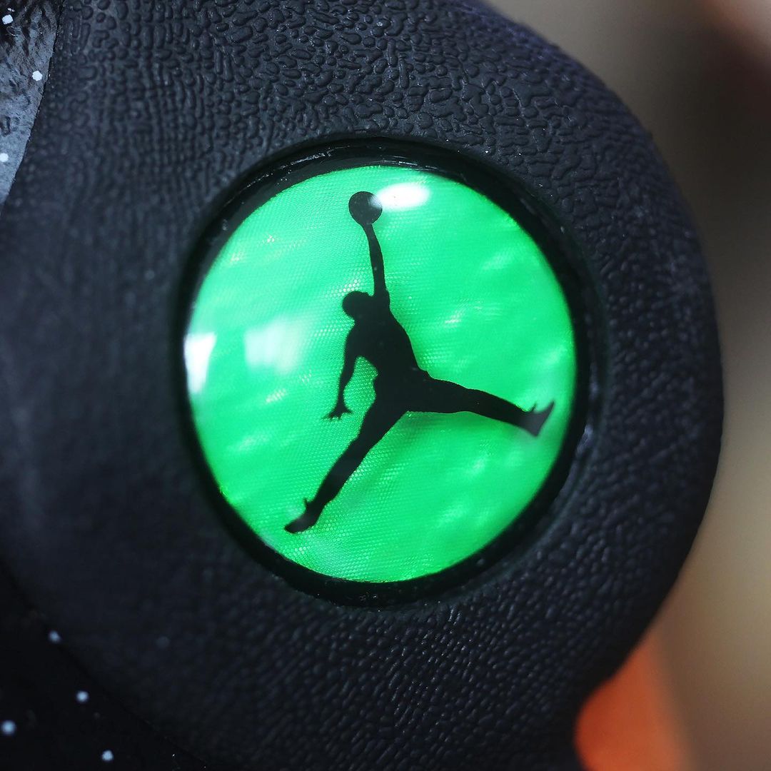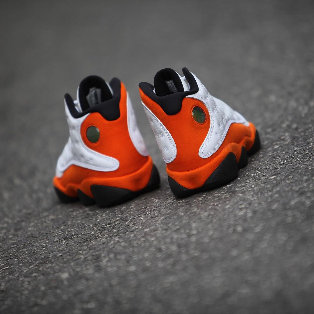 鞋身中下方以橙色麂皮材质覆盖,彰显出 Air Jordan 13 独有的规格,呈现出「扣碎」配色既视感。
