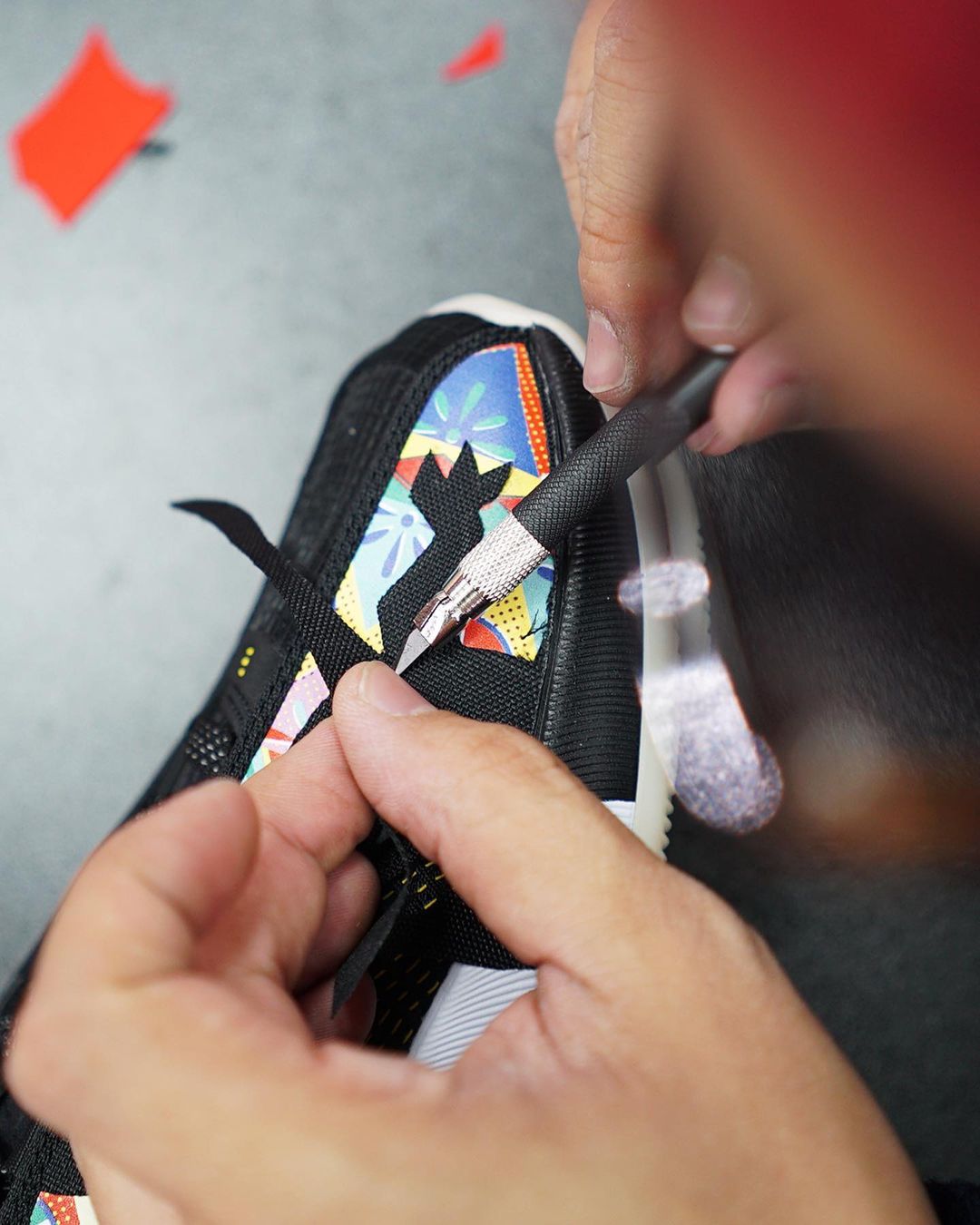 今年这两双 CNY 鞋款都是刮刮乐鞋面,设计以旧时爆竹包装纸上的印花图案为灵感来源,将其暗藏在半透明织物鞋面之下。