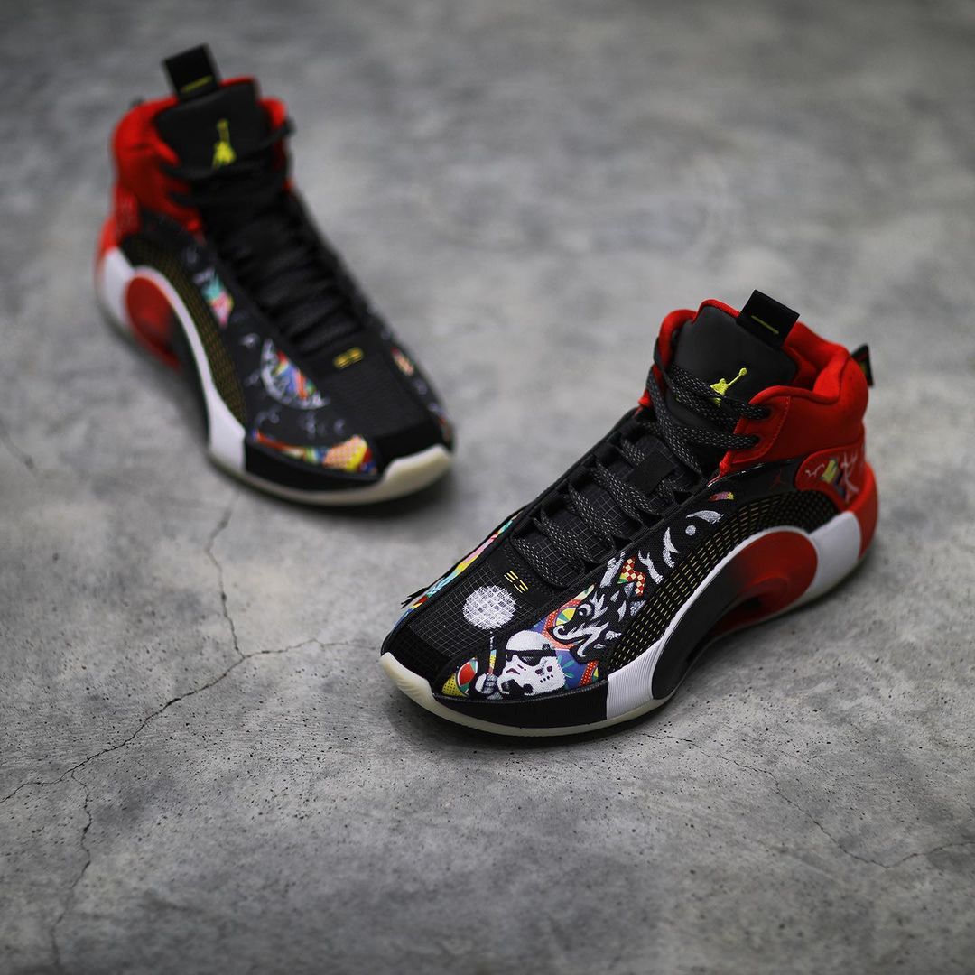 Air Jordan 35 在创意上更加新颖,不仅有传统的舞龙舞狮,还巧妙结合了星球大战经典角色白兵,白兵舞龙的主题绝对是脑洞大开,独具特色。