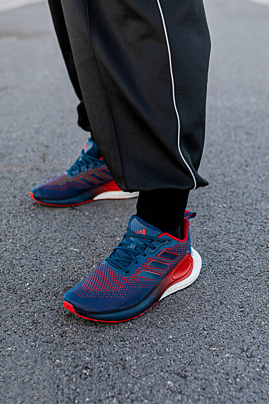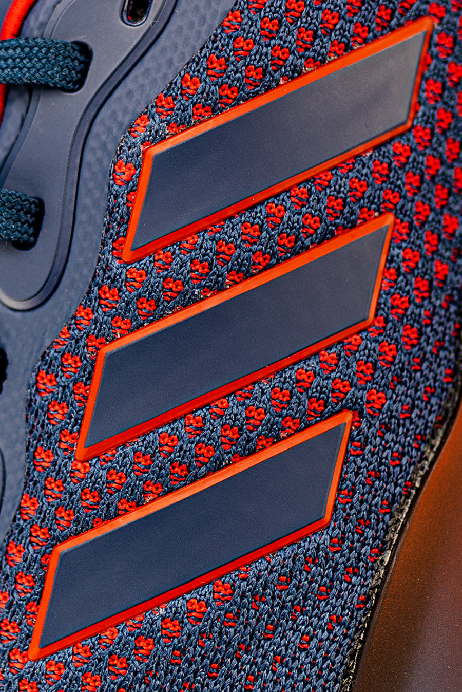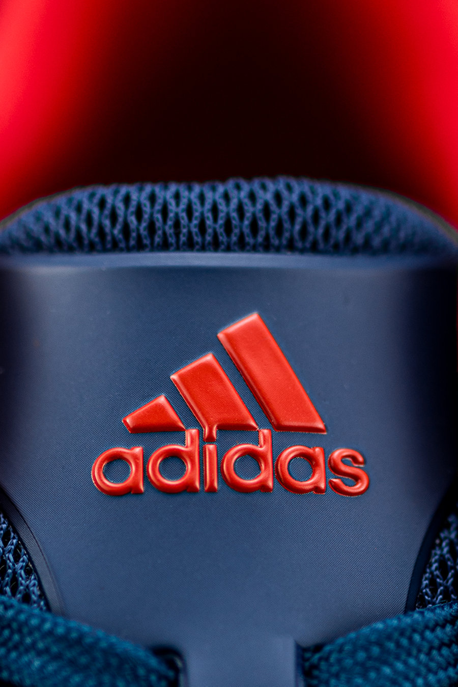 鞋身内外装饰 adidas 标志性三道杠,海军蓝色填充,辅以红色线条勾勒。