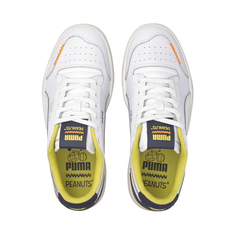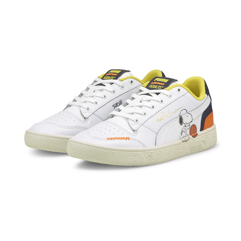 第二双以 Ralph Sampson 鞋款为基础,利用鲜艳的色彩搭配纯白鞋身,侧身处缀以打篮球的史努比图案,彰显联名身份。