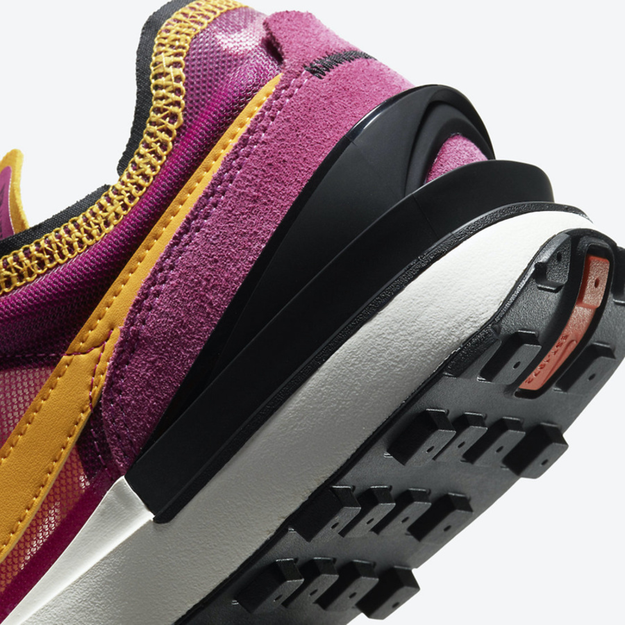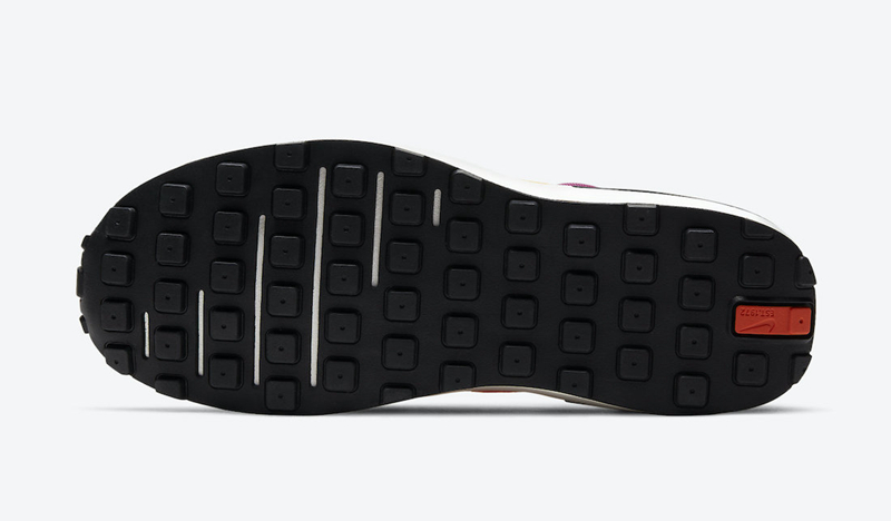 鞋身以 Nike 元祖级跑鞋 Daybreak 的标志性轮廓为蓝本,采用浆果色网眼鞋面,鞋头覆盖黑色麂皮。