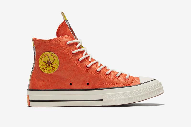 以放爆竹为灵感的 Chuck 70 鞋身整体以爆竹包装纸相同的橘红色为主,鞋头及中底部分选用白色。