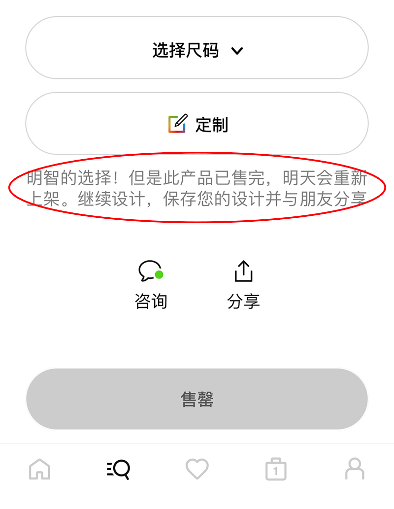 值得注意的是,在迅速售罄之后的页面下方,出现一行文字:「明智的选择!但是此产品已售完,明天会重新上架。继续设计,保存您的设计并与朋友分享」