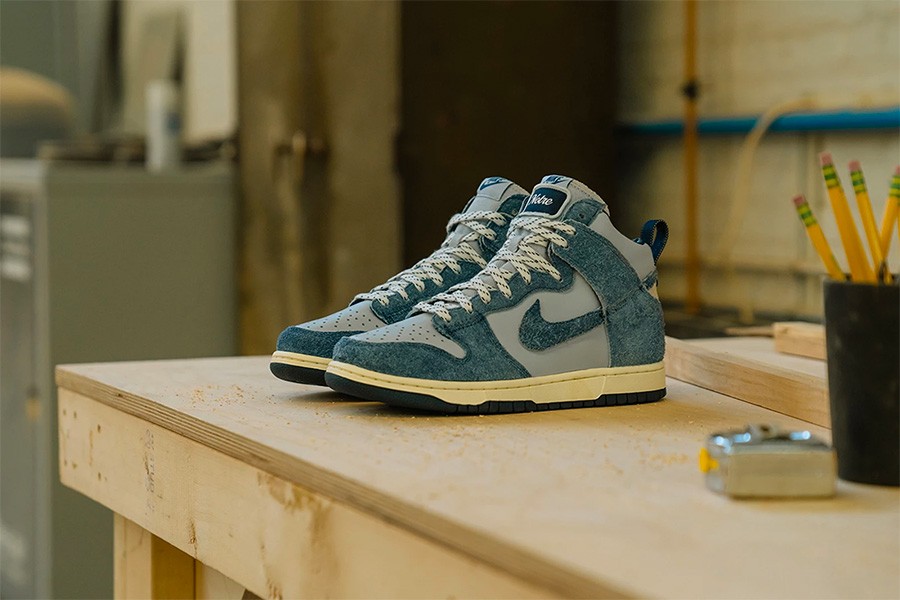 Notre x Nike Dunk High 采用了翻毛皮和帆布搭配,营造了熟悉的 OG 复古效果,简约又经典,也格外迎合当下大热的 Vibe 风格。