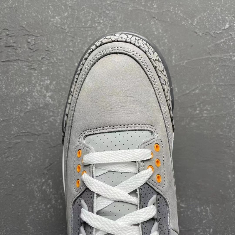 鞋身以灰色皮革材质打造,提升整体质感,细节处添加爆裂纹彰显自身 Air Jordan 3 血统,鞋舌、鞋带孔和后跟部位点缀红黄细节,完善整双鞋款设计。