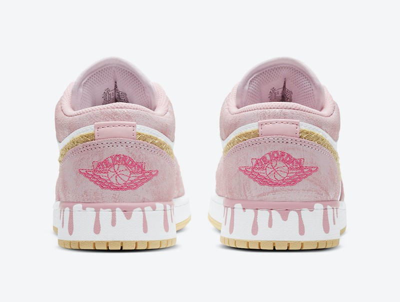 后跟飞翼 Logo 刺绣则彰显着 AJ1 家族的专属身份,粉嫩的颜色也营造出可爱的气息。