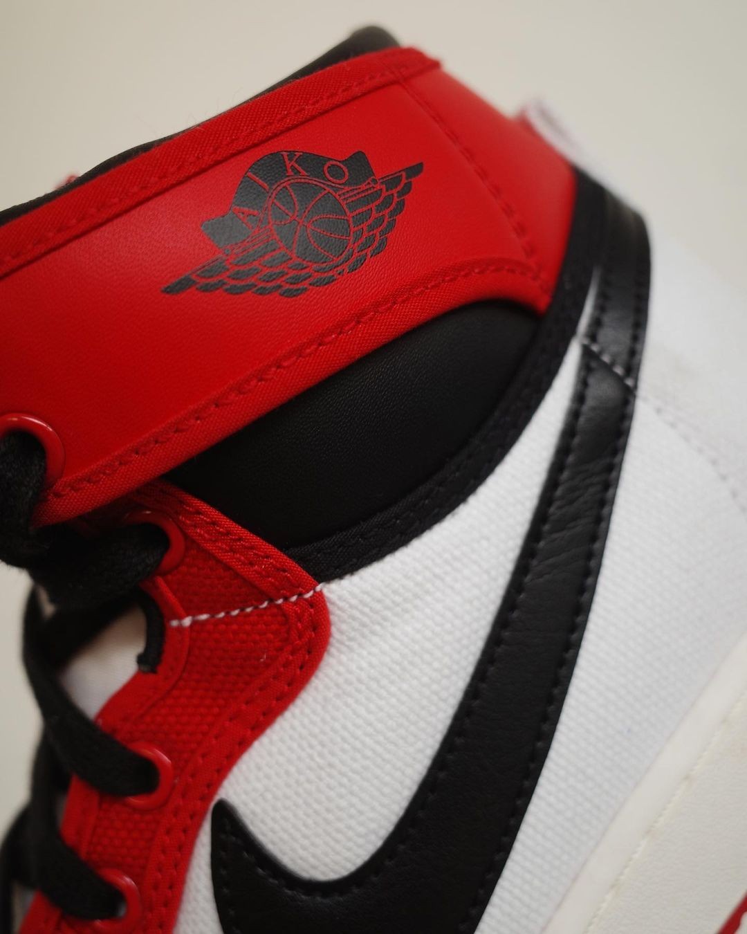鞋帮处的飞翼 Logo 为 AJKO 字样,与 Air Jordan 1 High 有所不同。