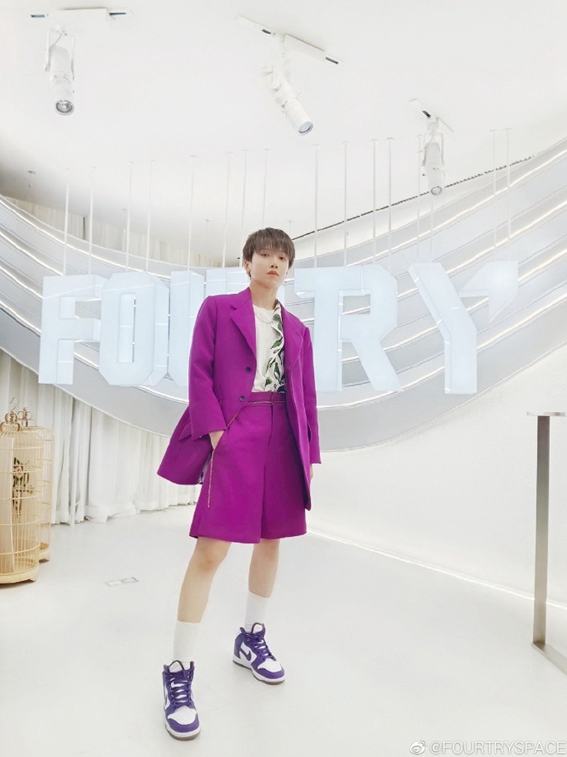 一袭紫色西装套装,搭配上今年最火的 Dunk High 鞋款,将混搭风格完美呈现。