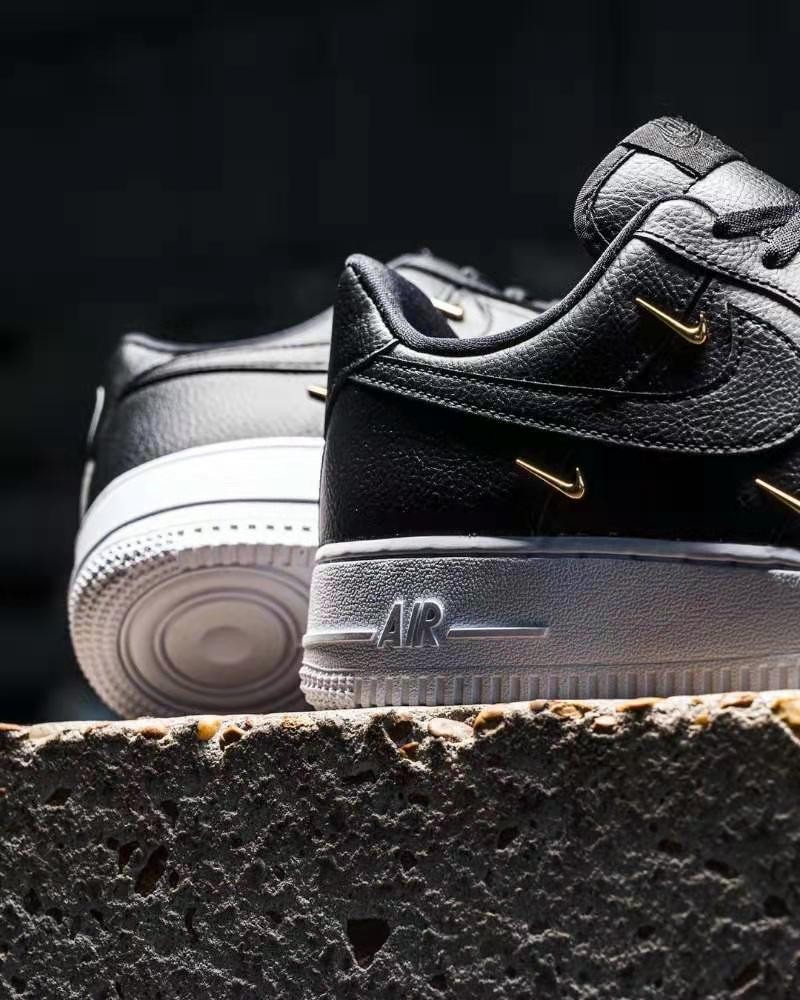 值得注意的是,这双鞋两侧的多个金属 Mini Swoosh 装饰及金属鞋带扣标识均选用了金色,颇为亮眼。