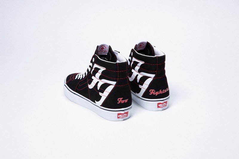 本次合作以 Vans 经典 Sk8-Hi 鞋款作为蓝本,鞋面采用黑色为主,搭配红色缝线形成撞色设计。