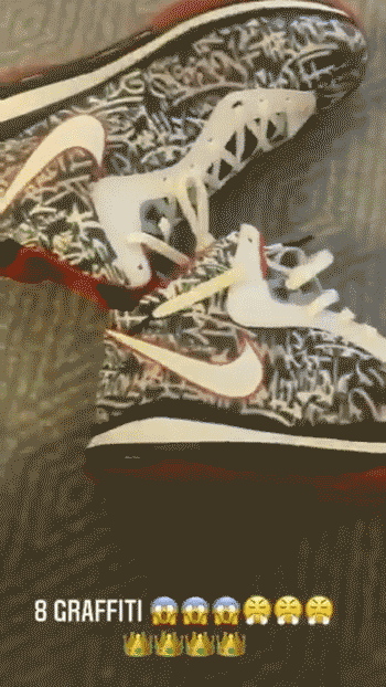 他的原话是 “LeBronWatch is back”,并给大家展示了第一双,也就是昨天突袭发售的涂鸦配色 LeBron 8 “Graffiti”。