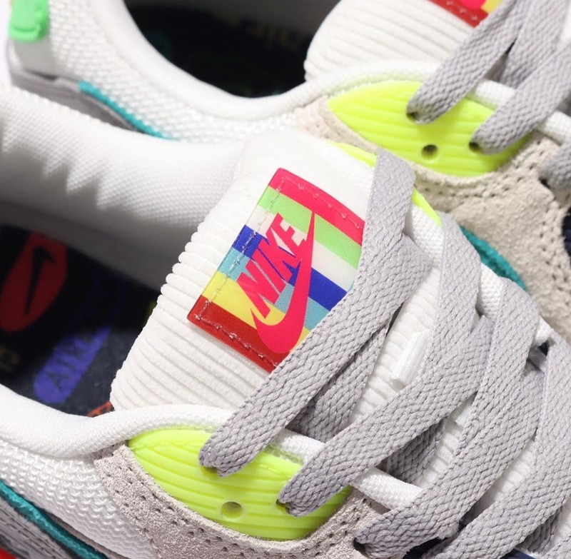 鞋舌上同样以灯芯绒样式呈现,搭配七种颜色拼接组成的 Nike Logo。