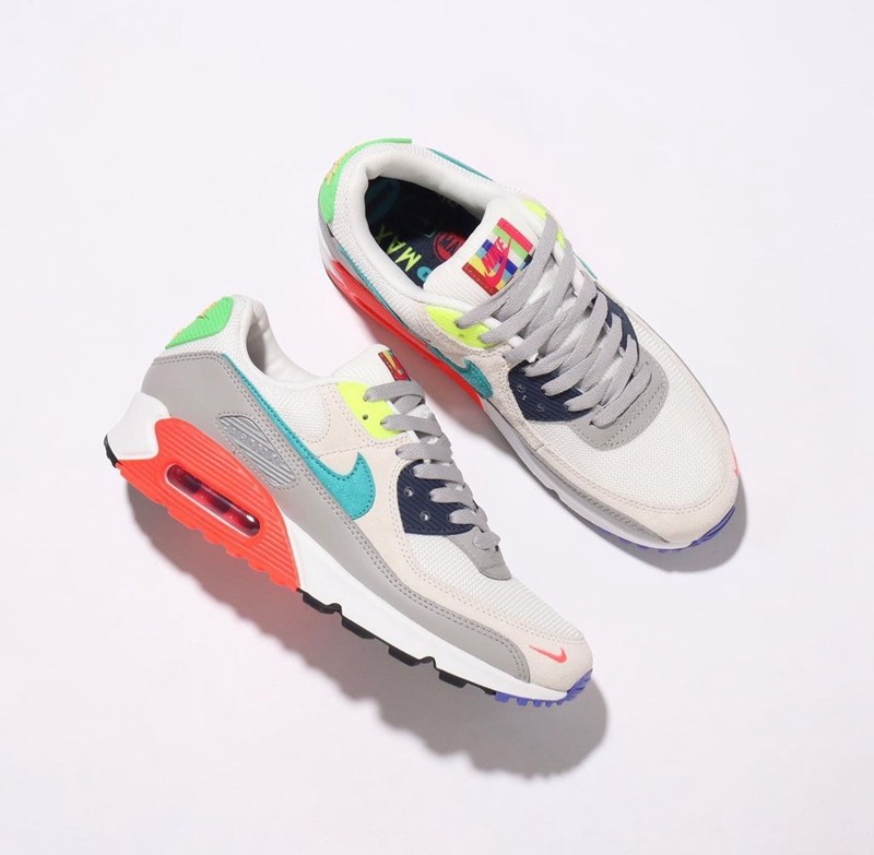 第二双以 Air Max 90 为基础通体白色鞋身,搭配上侧身处的湖水蓝色 Swoosh Logo 和后跟的绿色 Nike Logo,简约的同时不失亮眼细节。