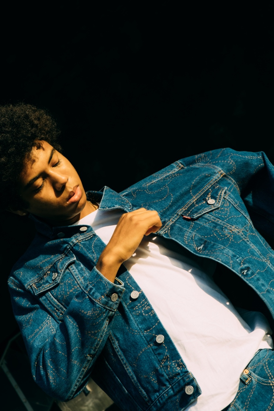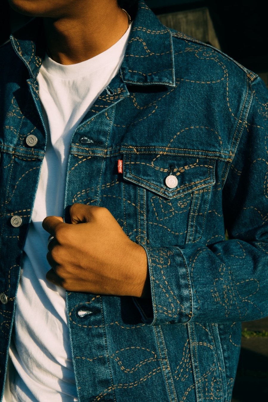 拉链牛仔夹克以 Levi’s 标志性的「Levi's® TYPE III SPLIT TRUCKER JACKET」为蓝本进行创作,并辅以颠覆性的对半拼接解构造型,正面以纽扣样式呈现,背面则以全拉链样式打造。