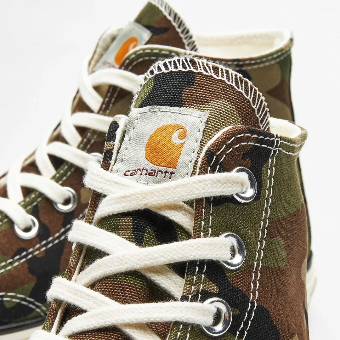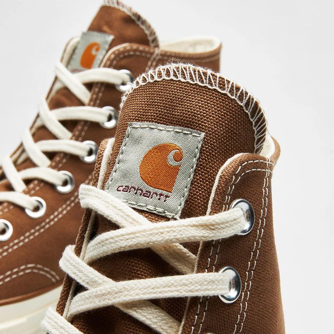 第一双鞋选用深棕色为主色调装饰鞋面,鞋舌缀有 Carhartt Logo 彰显联名身份。