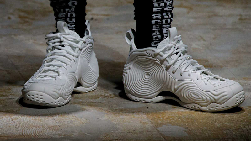 而本次现身的 CDG x Air Foamposite One 更罕见改变了鞋身纹理,采用类似水波纹的同心圆呈现。