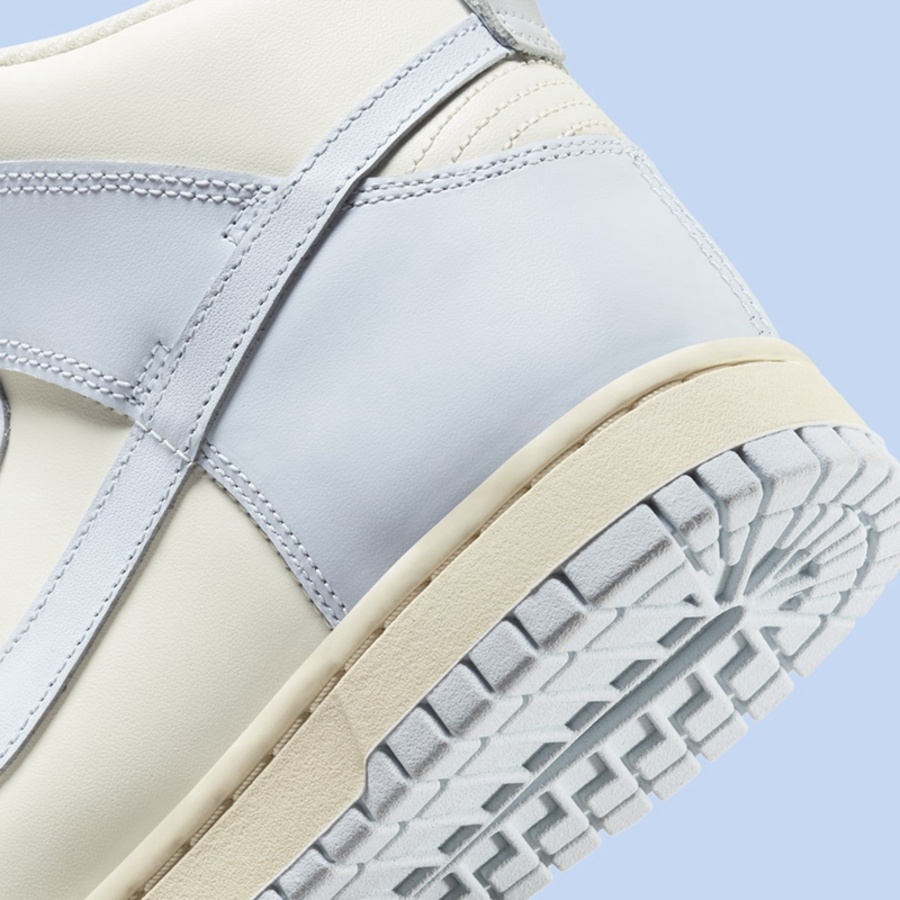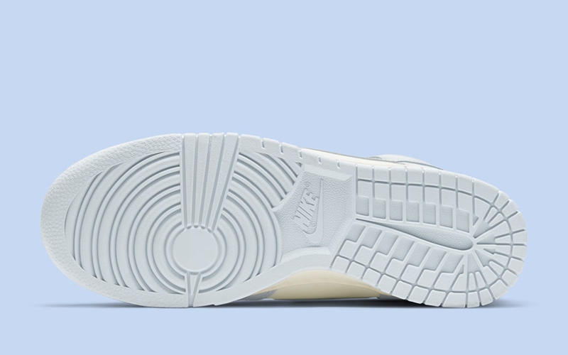整双鞋采用经典的 Dunk High 鞋型为蓝本打造,采用白色皮革材质打造鞋身主体,搭配低饱和度的淡紫色鞋身框架,也是近两年很火的马卡龙色系,简单甜美呈现出非常雅致的清新气质。