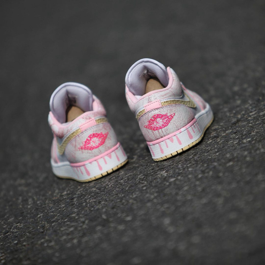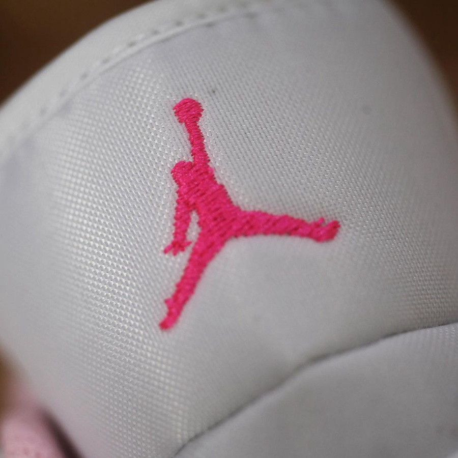 后跟装饰有象征 Air Jordan 1 家族专属身份的飞翼 Logo,粉嫩的颜色也显得俏皮可爱。