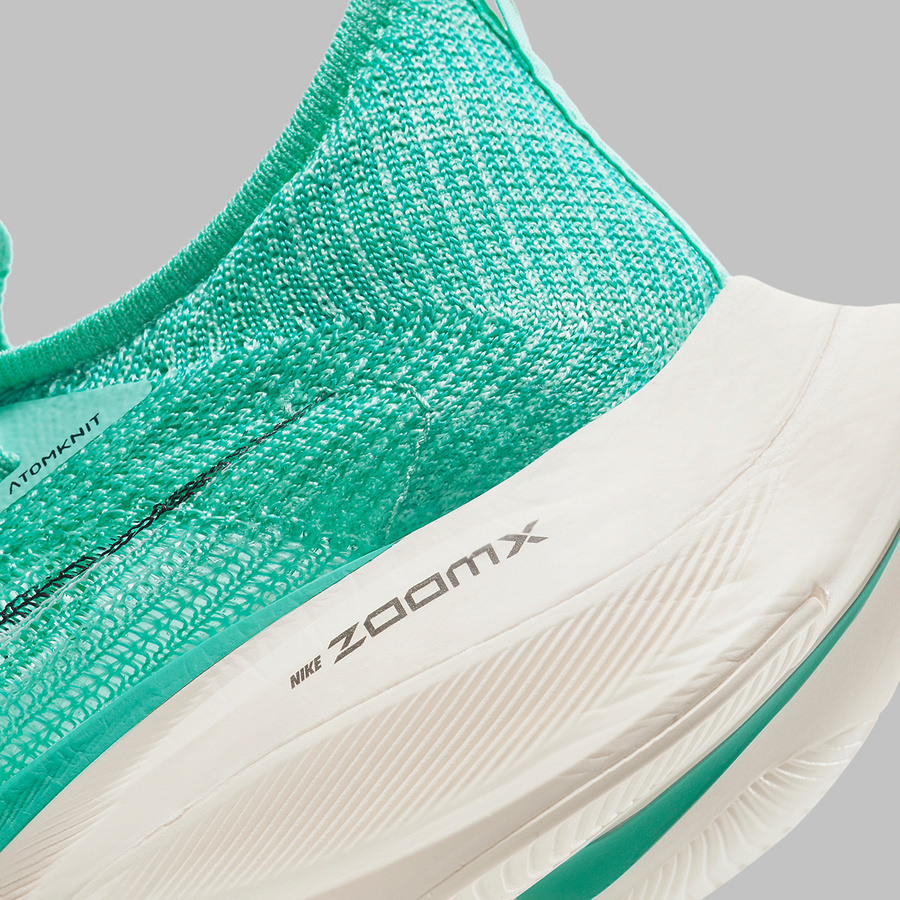中底湖绿色 Zoom 气垫与纯白 ZoomX 缓震泡棉搭配全掌型碳板设定,带来前所未有的强大推进力。