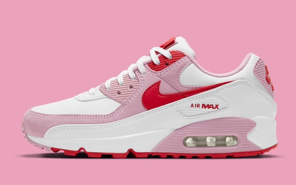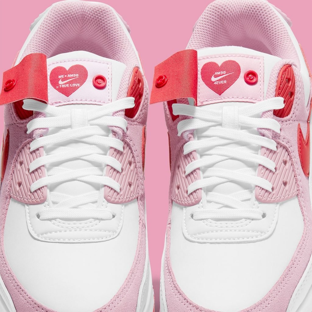 Air Max 90 与上一款 Air Force 1 相同,也是粉白配色搭配桃心冲孔和鞋舌细节。