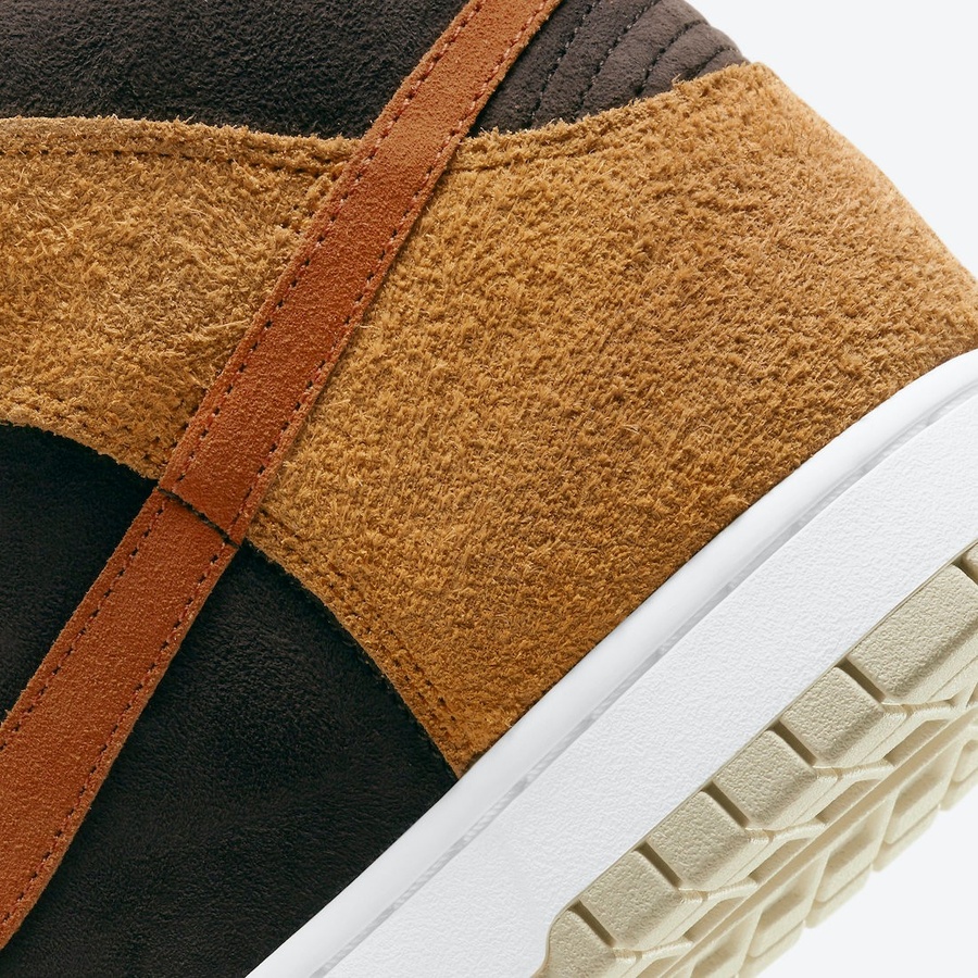 采用暗棕色麂皮打底,搭配小麦色翻毛皮组成鞋面,Swoosh 则采用了偏橙色的棕红翻毛皮。