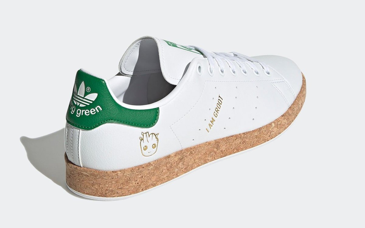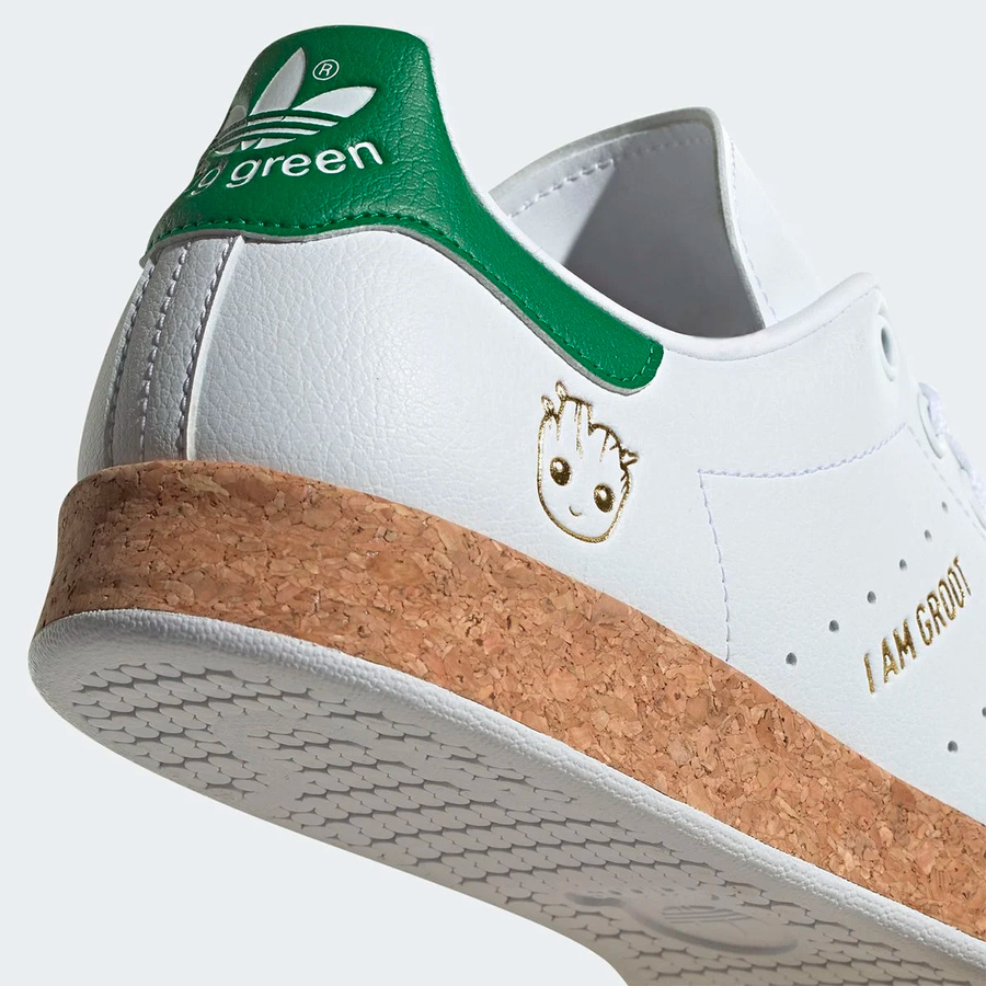 鞋身原本的 “STAN SMITH” 烫金字样改成了格鲁特知名口头禅 “I AM GROOT”。