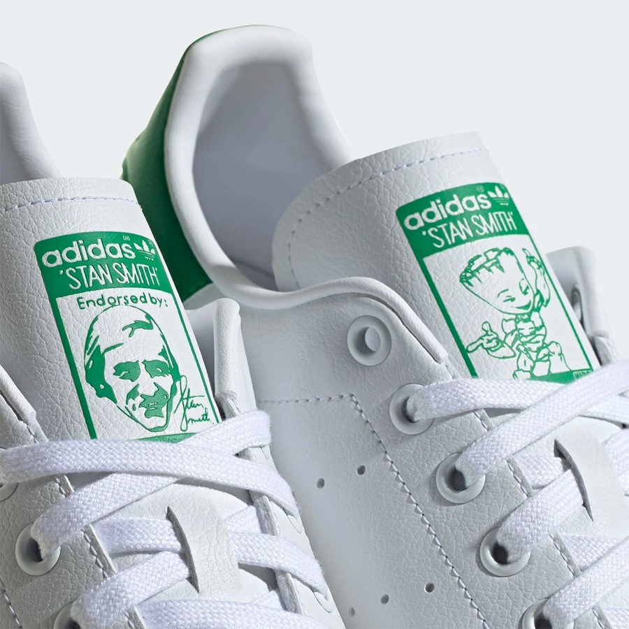 两只脚的鞋舌分别印有 Stan Smith 本人和格鲁特的画像。