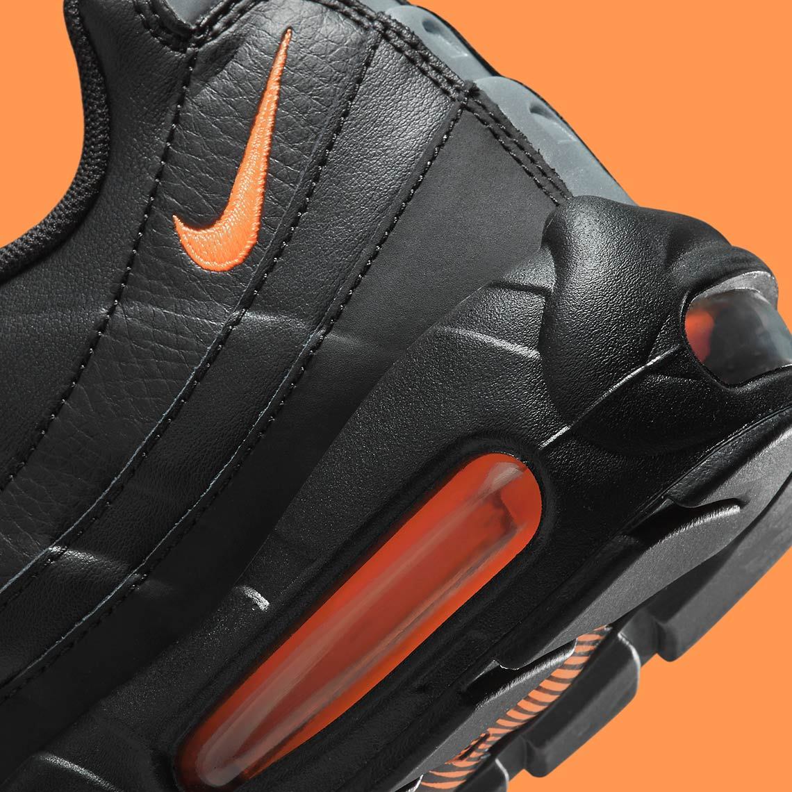 这双鞋以纯黑配色示人,仅在鞋舌标签以及后跟 Swoosh Logo 处点缀亮眼橙色。