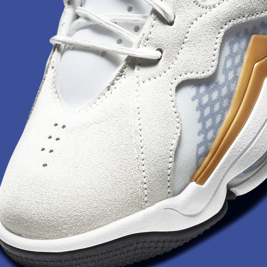 鞋面以白色网眼布和麂皮材质拼接方式打造,保证透气性的同时提升鞋面层次感,侧面补强和 Swoosh Logo 选用金色点缀,提升亮眼效果。