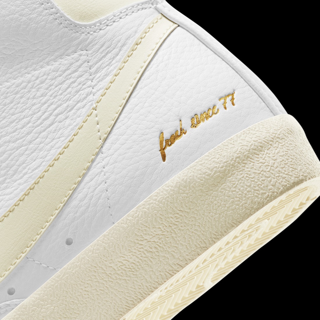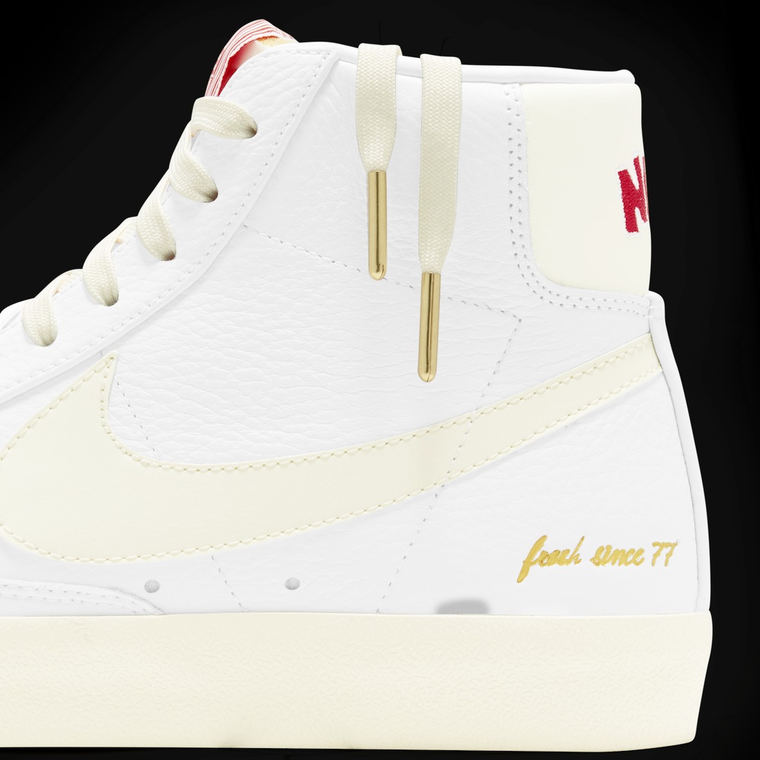 鞋舌及后跟处加入红色标识作为点缀,脚踝处金色 “Fresh since '77” 字样颇为亮眼。
