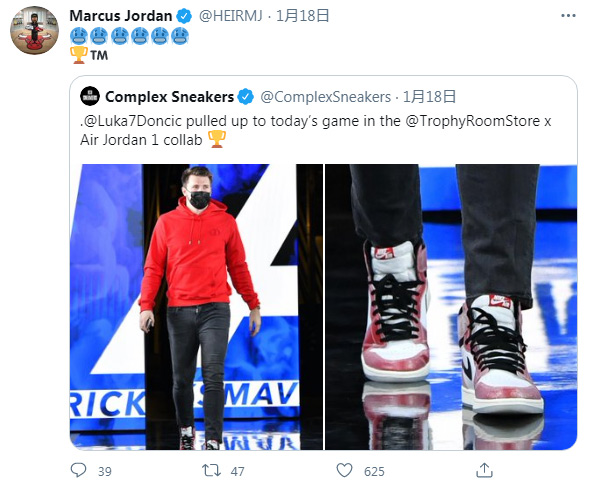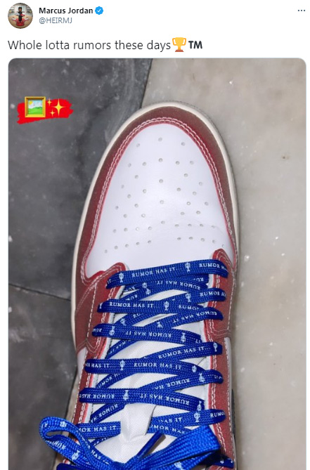 抛开这几件事情的真假不谈,最近 Marcus Jordan 在晒出这双鞋 Trophy Room x Air Jordan 1 的发售信息时居然是一款蓝色鞋带版本。