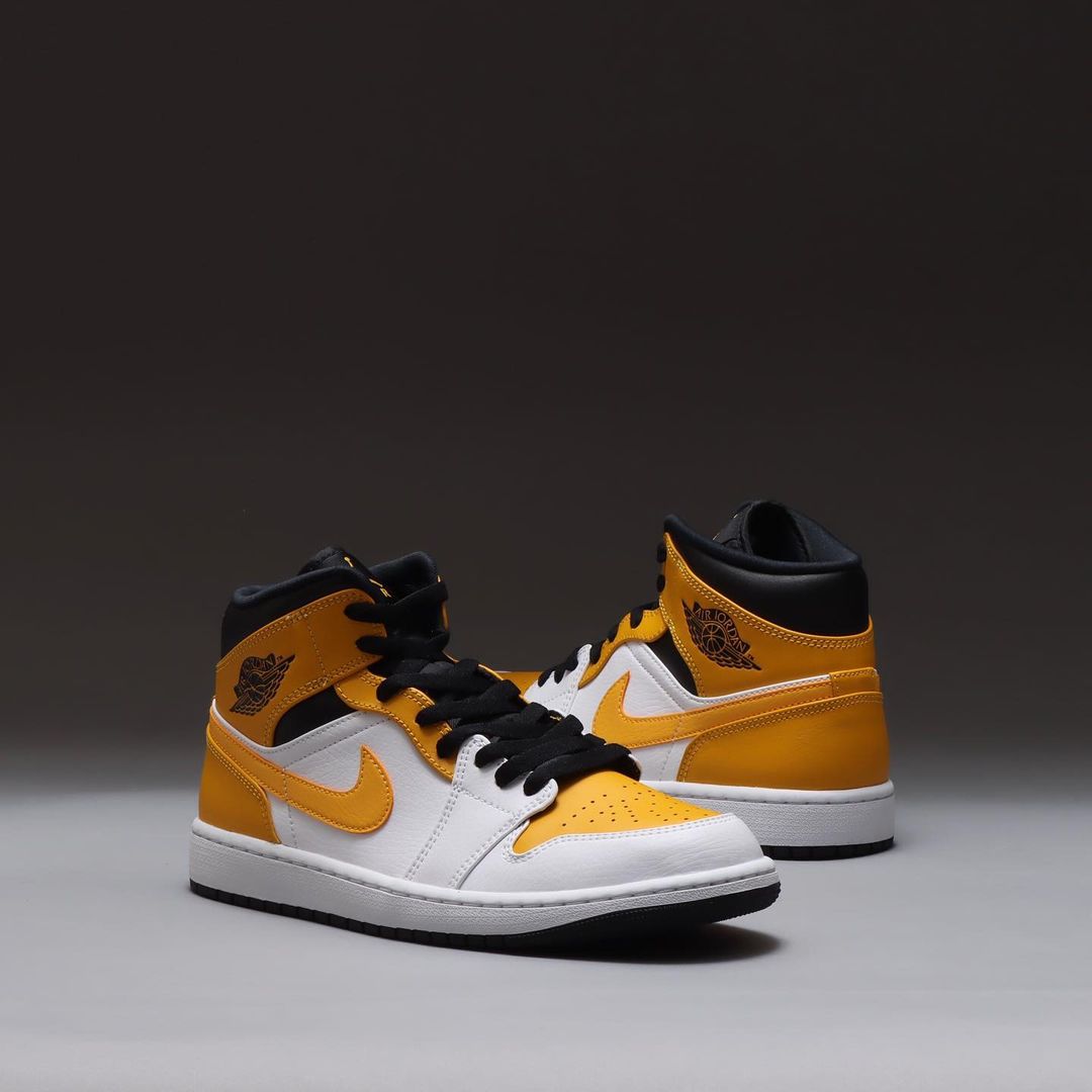 Air Jordan 1 Mid 的货号为 554724-170,以白黄色调辅以黑色细节,更加的清爽,也更具运动活力,在视觉上更为均衡,相信在街头的穿搭定有不俗效果。