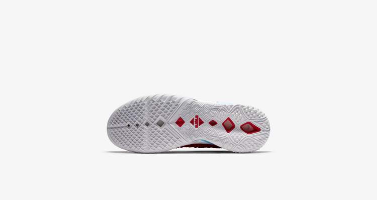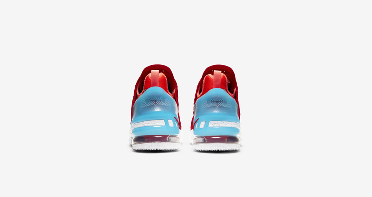 整体配色采用喜庆的大红为主调,后跟则辅以水蓝色 TPU 映衬。