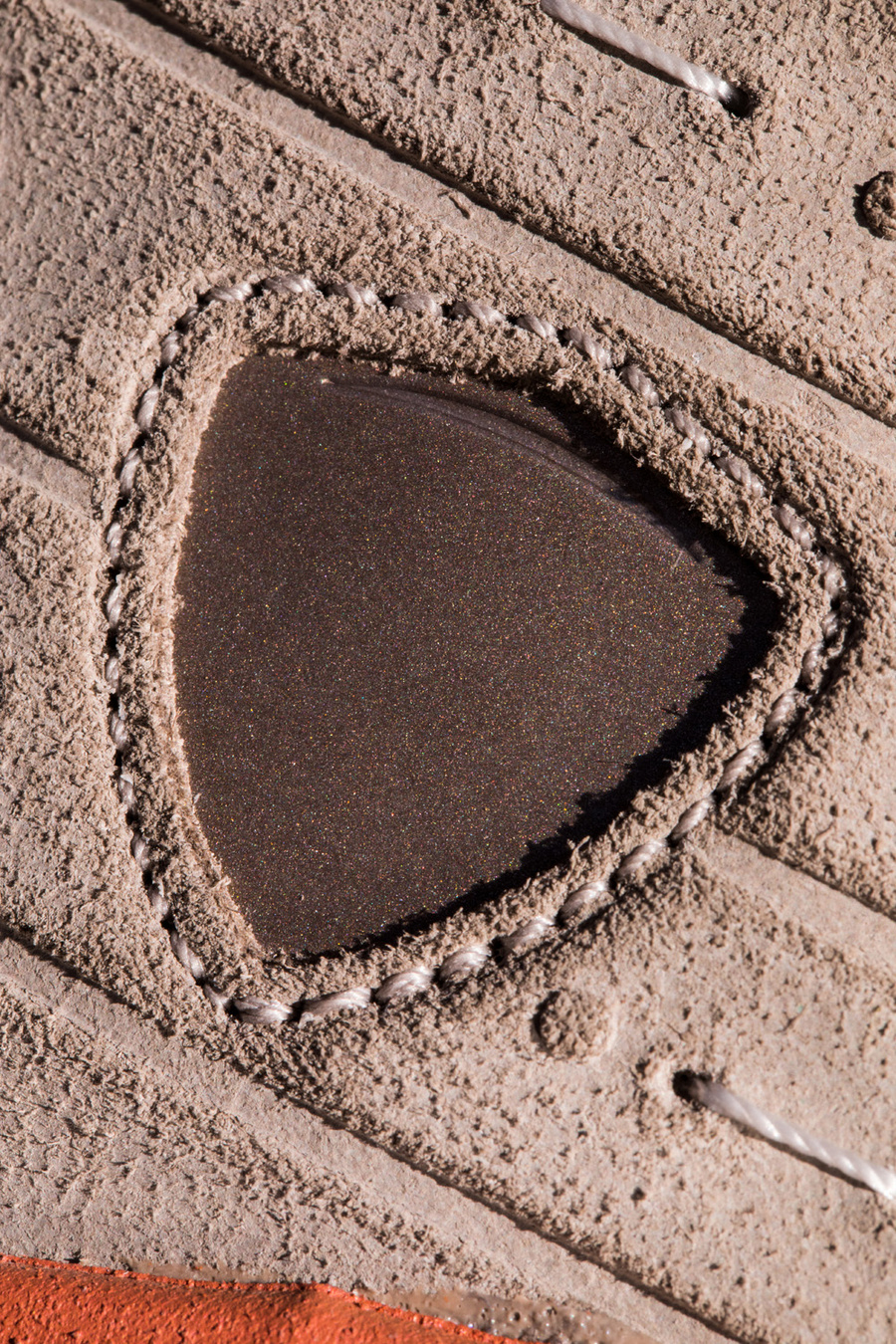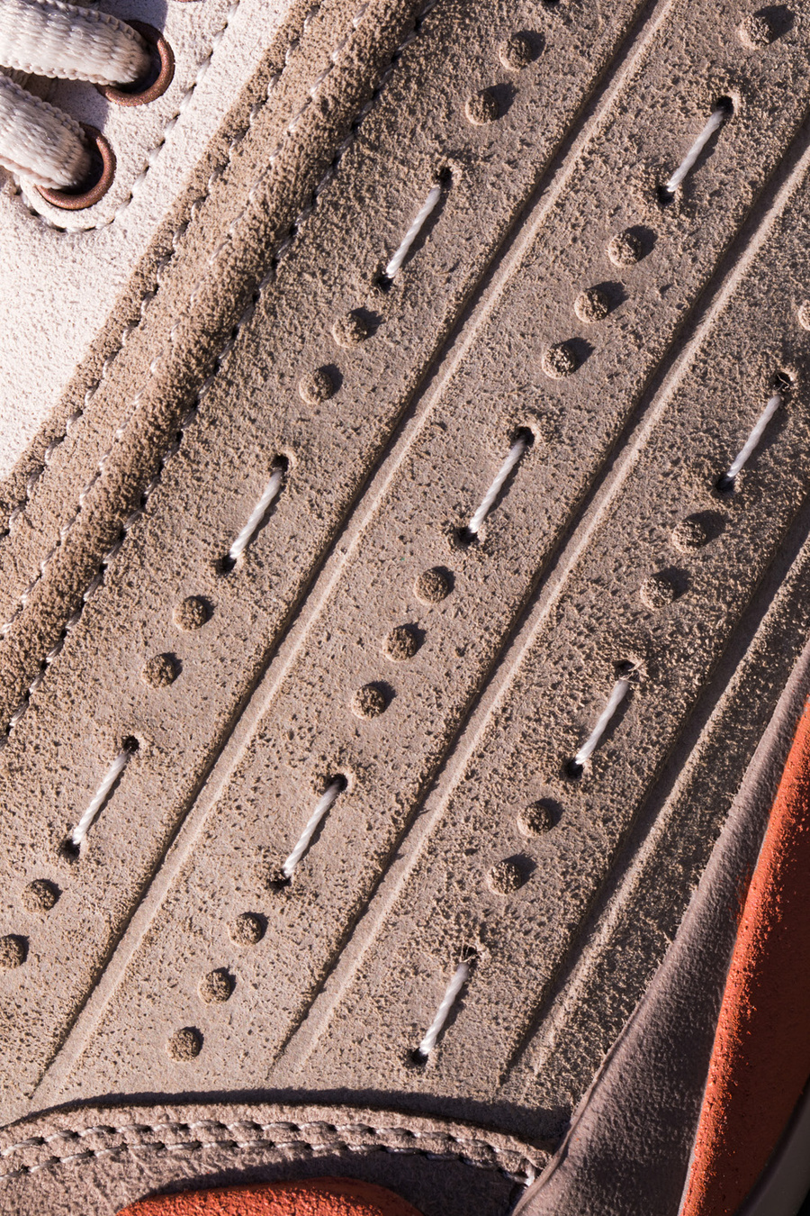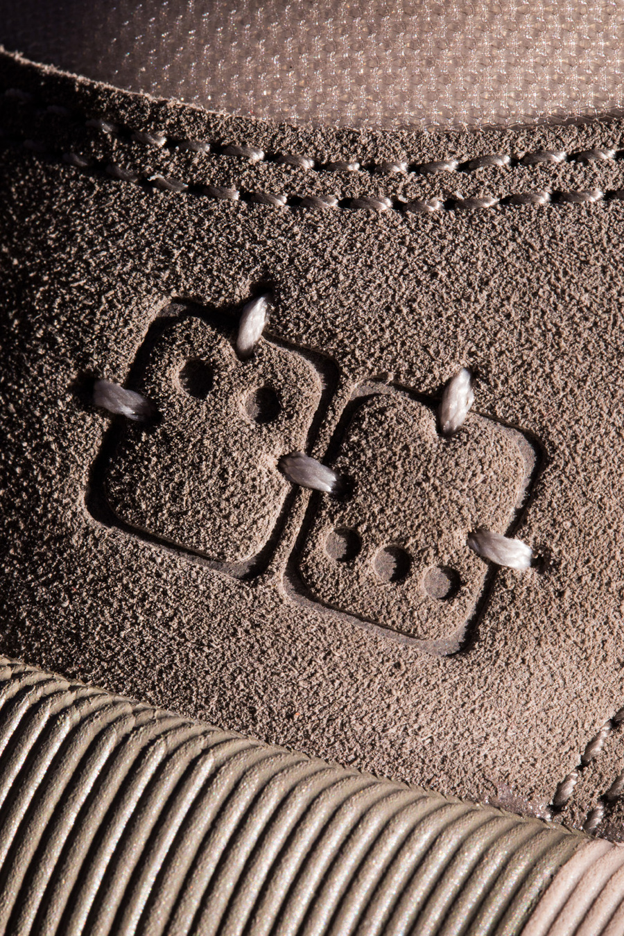 鞋面选用柔和的灰色翻毛皮,不同深浅的灰色拼接,金色鞋带孔加以点缀。