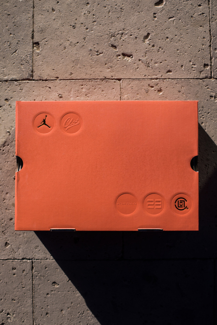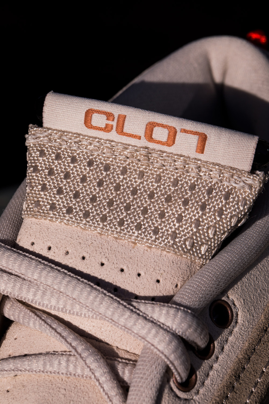 鞋舌灵感源于中国传统卷轴,左右脚的鞋舌上分别有 JORDAN 和 CLOT 字样。