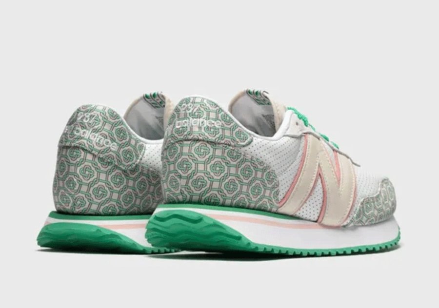 本次合作选择了 NB 旗下另一全新鞋型 237,鞋身整体以白色为主,加入淡粉色、淡绿色作为点缀,鞋头及后跟处注入图腾纹理设计,颇为独特。